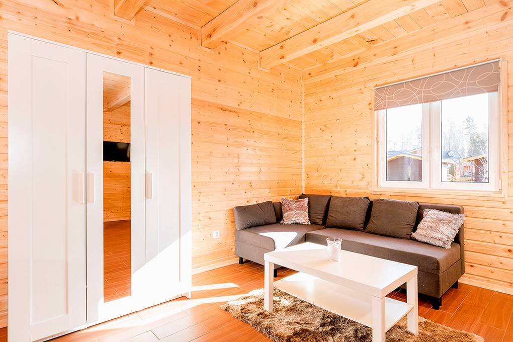 Haus: Schöne Ferienhausanlage mit 10 Ferienhäusern auf einem 2 ha großem Rasengrundstück, 2018 neu erbaut. Sehr großzügige Holzhäuser mit freundlicher Einrichtung. Rustikal gemütlicher Flair durch Holzbalkendecken. Heizung mit E-Radiatoren, Warmwasser über E-Boiler (80 l.). Balkon. Teilweise überdachte Terrasse mit Sitzmöbeln, Grill (leihbar gegen Gebühr). 2 Parkplätze/ Ferienhaus auf umzäuntem Grundstück (Gebühr).