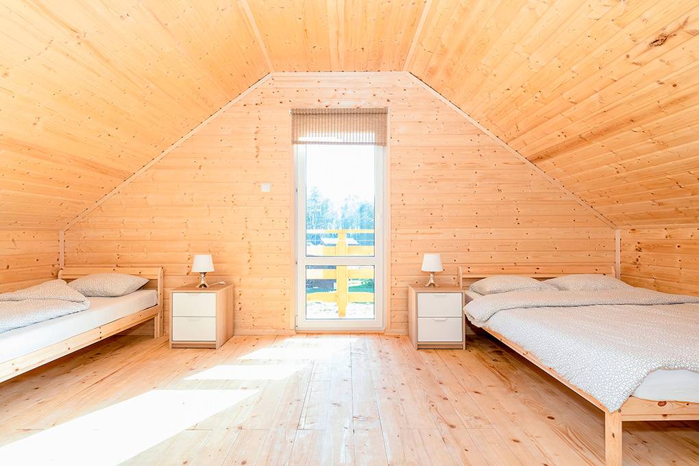 PL 44.9 Ferienhaus 2-8 Pers.: Geräumiges 3-Zimmerhaus mit 80 qm Wohnfläche über 2 Etagen. Parterre: Wohn-/Essraum mit Couchgarnitur (Schlafsofa für 2 Pers.), Flachbild Sat-TV mit deutschen Programmen, Internet über W-Lan, Esstisch, Küchenzeile (2 Pl. Induktion, Mikrowelle). Bad/WC. Dachgeschoss: zwei 3-Bettzimmer jeweils mit Doppelbett, Einzelbett, eines davon mit Balkon. Teilüberdachte Terrasse mit Sitzmöbeln, davor Grünfläche.