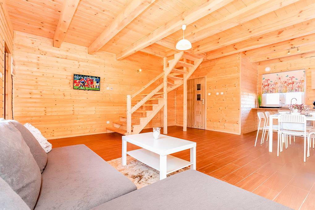 PL 44.9 Ferienhaus 2-8 Pers.: Geräumiges 3-Zimmerhaus mit 80 qm Wohnfläche über 2 Etagen. Parterre: Wohn-/Essraum mit Couchgarnitur (Schlafsofa für 2 Pers.), Flachbild Sat-TV mit deutschen Programmen, Internet über W-Lan, Esstisch, Küchenzeile (2 Pl. Induktion, Mikrowelle). Bad/WC. Dachgeschoss: zwei 3-Bettzimmer jeweils mit Doppelbett, Einzelbett, eines davon mit Balkon. Teilüberdachte Terrasse mit Sitzmöbeln, davor Grünfläche.