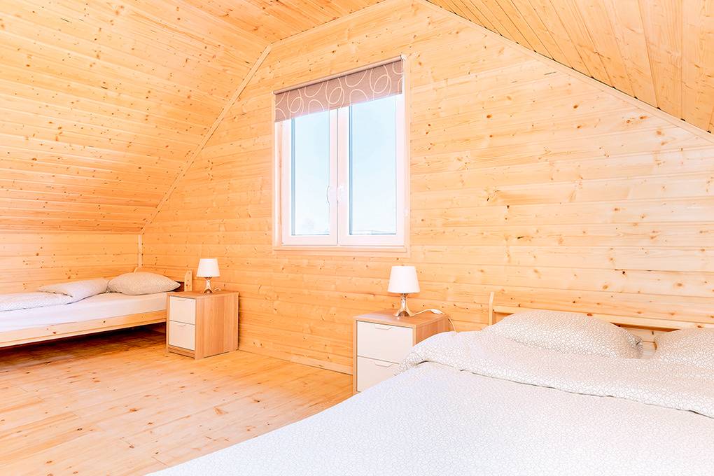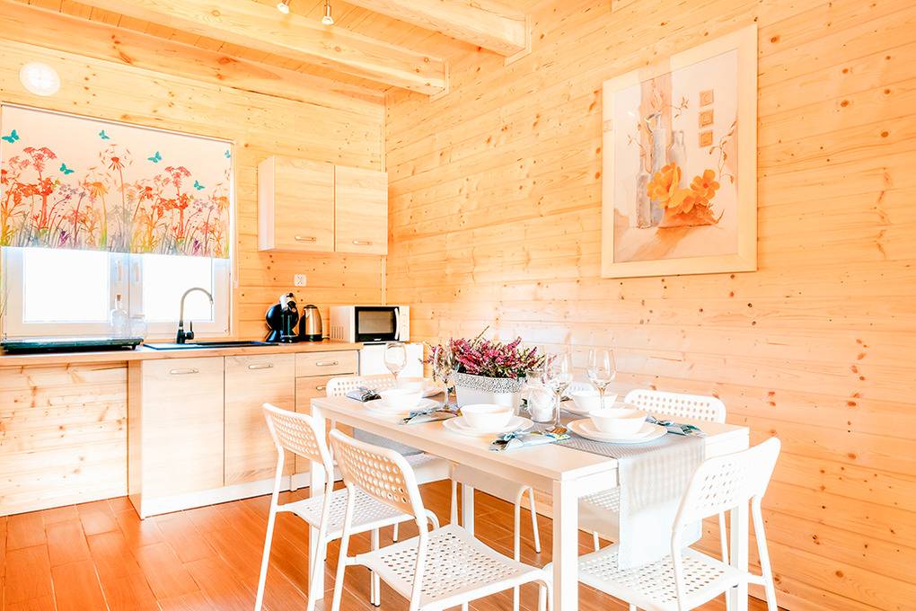 Haus: Schöne Ferienhausanlage mit 10 Ferienhäusern auf einem 2 ha großem Rasengrundstück, 2018 neu erbaut. Sehr großzügige Holzhäuser mit freundlicher Einrichtung. Rustikal gemütlicher Flair durch Holzbalkendecken. Heizung mit E-Radiatoren, Warmwasser über E-Boiler (80 l.). Balkon. Teilweise überdachte Terrasse mit Sitzmöbeln, Grill (leihbar gegen Gebühr).2 Parkplätze/ Ferienhaus auf umzäuntem Grundstück (Gebühr).