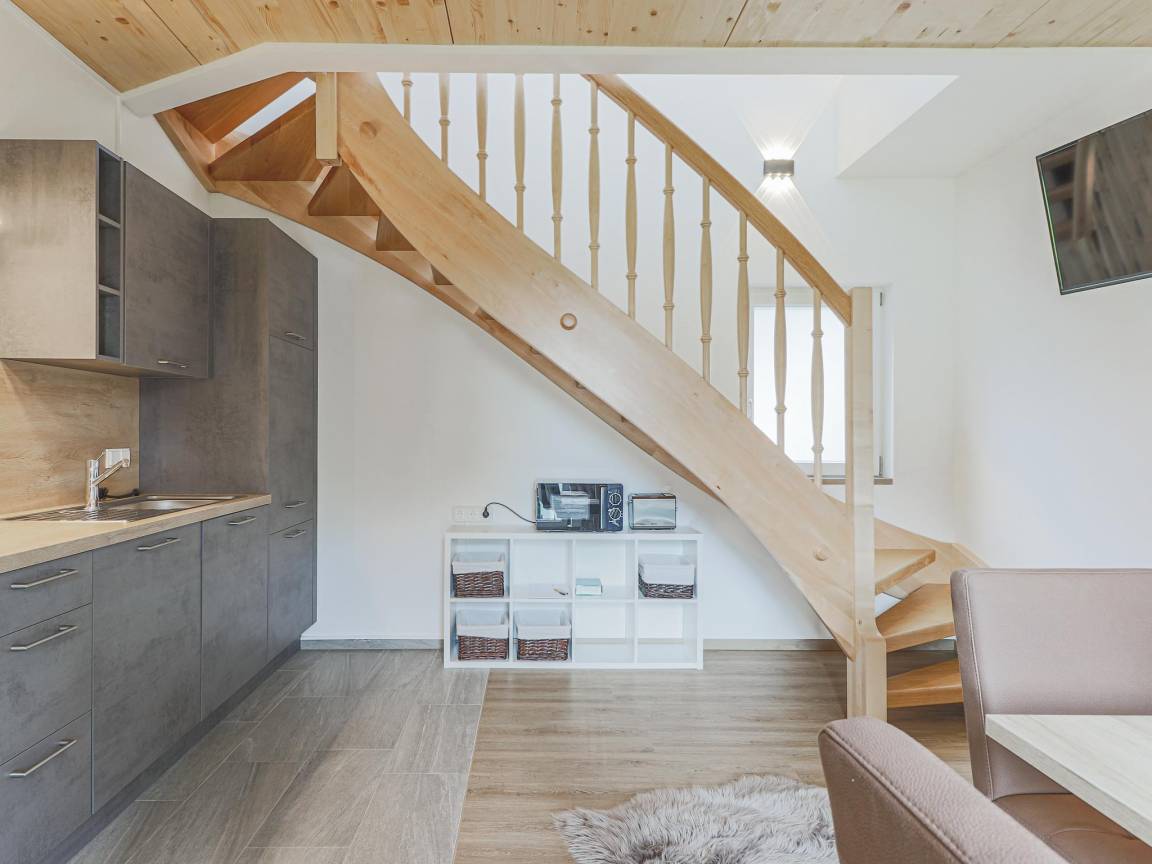 Layout : In der 1. Etage: Wohnzimmer mit TV , offene Küche mit Kochherd, Kaffeemaschine(Filter), Backofen, Geschirrspüler, Kühl-/Gefrierkombination , Badezimmer mit Dusche, Waschbecken, Toilette