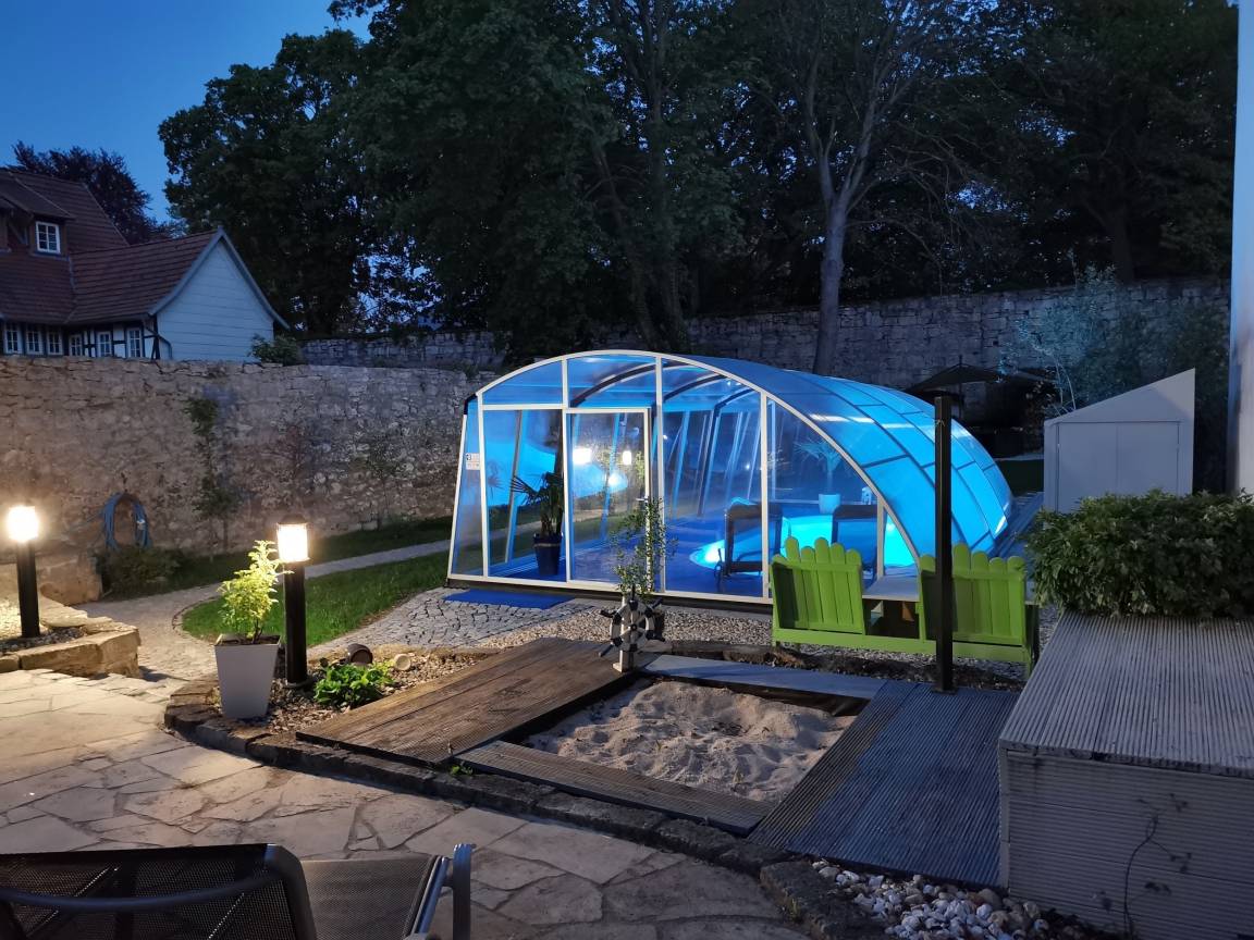 Der liebevoll angelegte Garten mit altem Baumbestand und einem Stück der historischen Stadtmauer lädt zum Verweilen ein. Bequeme Liegestühle, eine offene und eine überdachte Terrasse bieten Raum zum Entspannen. Highlight für viele Gäste ist der neue, beheizte Indoorpool mit verschiebbarem Dach, römischer Treppe, Gegenstromanlage und Sonnenliegen – nutzbar von Mai bis September.