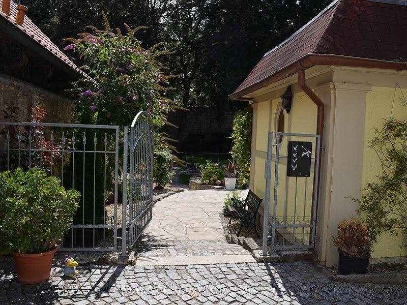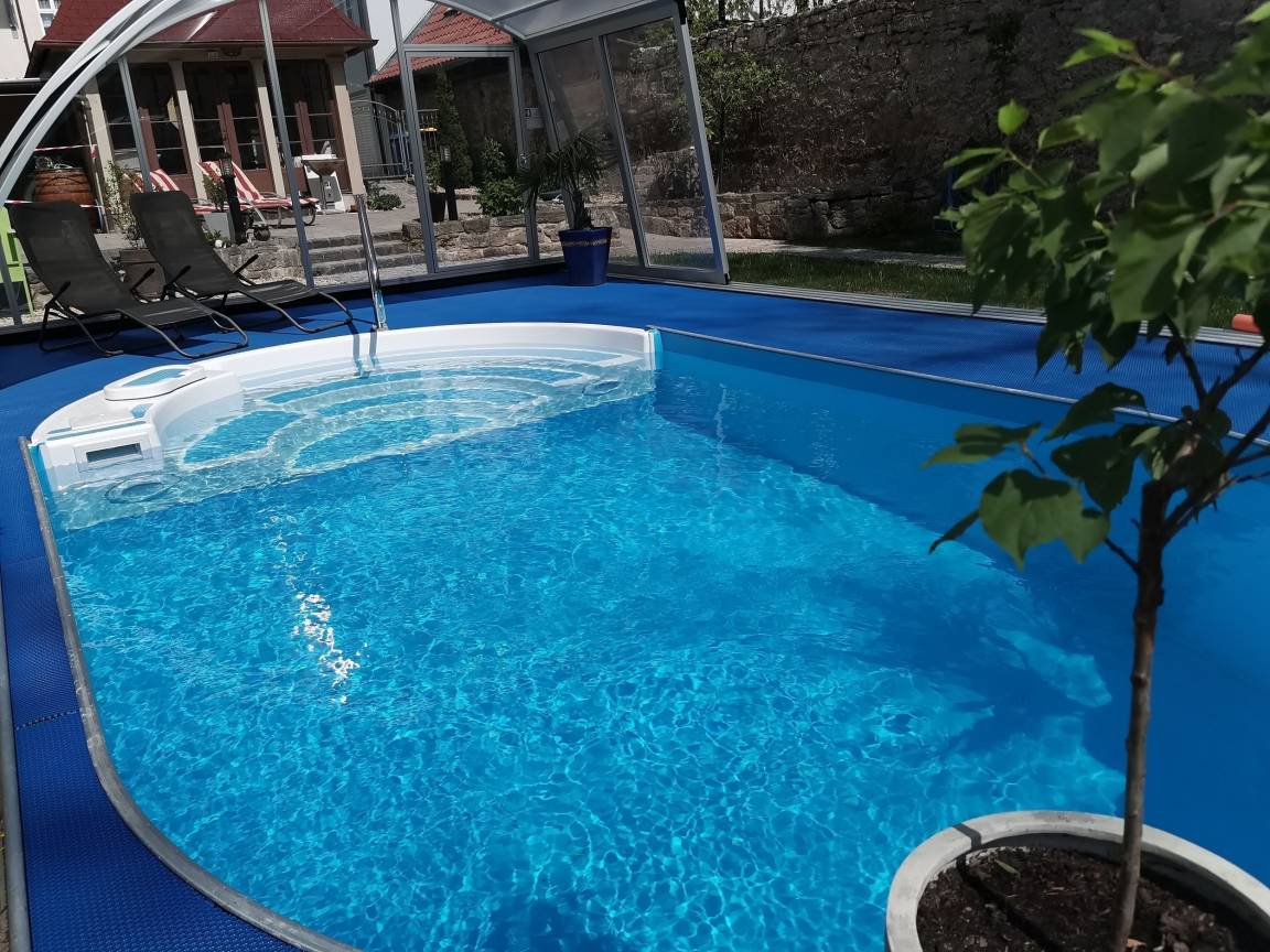 Der liebevoll angelegte Garten mit altem Baumbestand und einem Stück der historischen Stadtmauer lädt zum Verweilen ein. Bequeme Liegestühle, eine offene und eine überdachte Terrasse bieten Raum zum Entspannen. Highlight für viele Gäste ist der neue, beheizte Indoorpool mit verschiebbarem Dach, römischer Treppe, Gegenstromanlage und Sonnenliegen – nutzbar von Mai bis September.