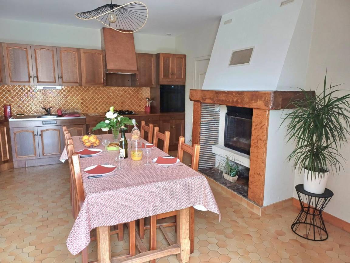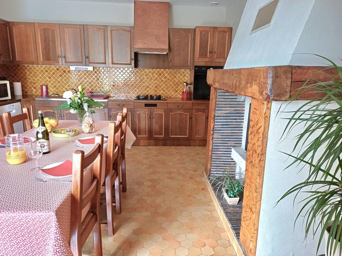Ebenerdiges Ferienhaus: Esszimmer mit Einbauküche, Heizkamin, Wohnzimmerecke, 1 Schlafzimmer (1 Doppelbett), 1 Schlafzimmer (2 Einzelbetten), Badezimmer (Badewanne), WC, Zentralheizung mit Heizöl, Garage, überdachter Bereich und 2 Terrassen. Babyausstattung auf Anfrage, Sitz, Kinderwagen, Badewanne und Babybett.