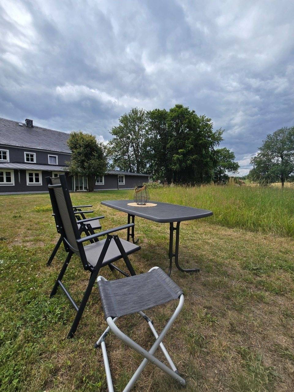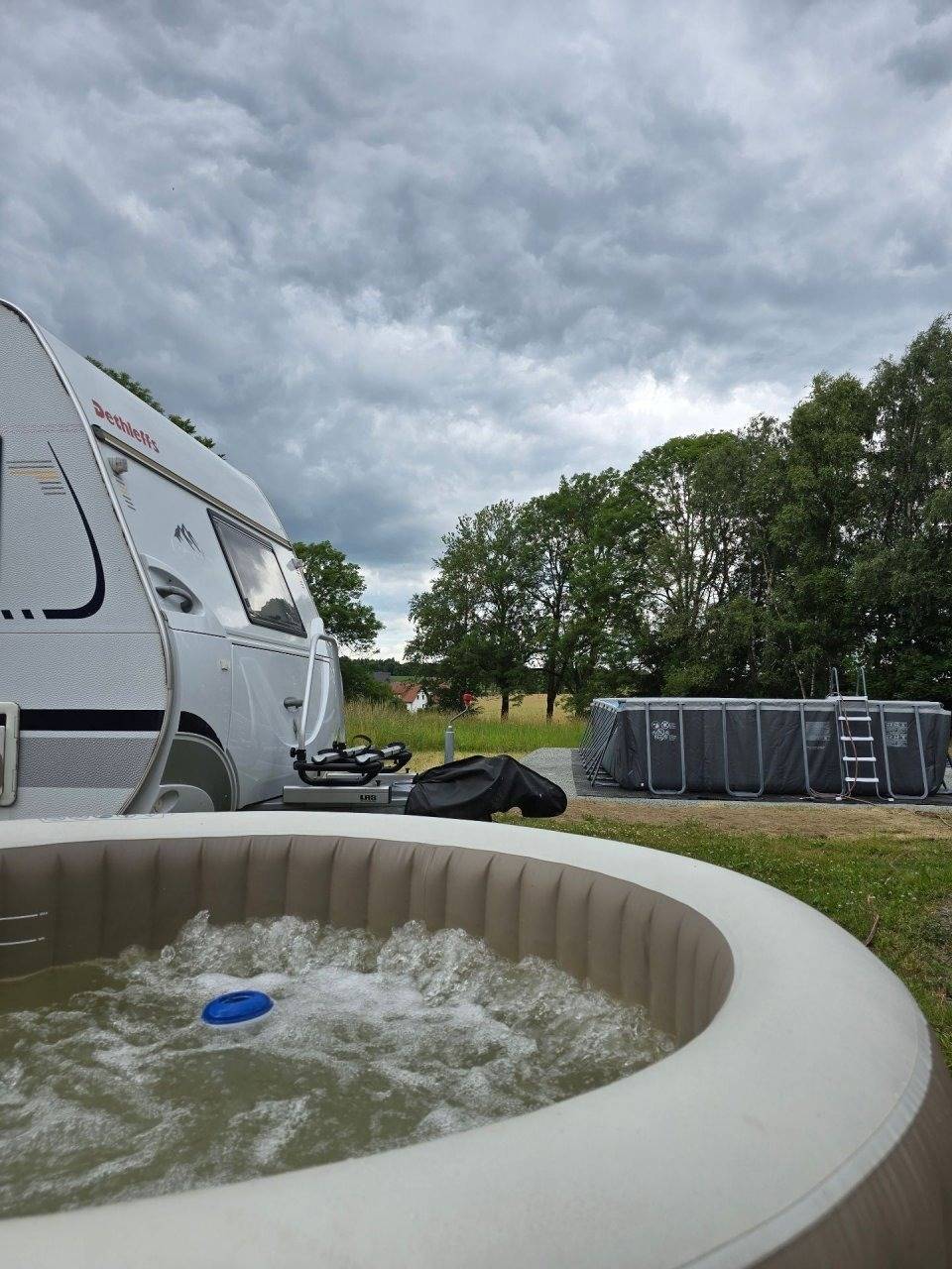Wir vermieten hier unseren Wohnwagen auf unserem Hof komplett wie abgebildet mit großem Außenpool, Whirlpool, Feuerplatz und High End Delux Caravan. Der Caravan hat von Fußbodenheizung über Klimaanlage, Pizzaofen, Durchlauferhitzer bis hin zur voll ausgestatten Dusche und WC alles und noch mehr, was eine kleine Wohnung nicht bieten kann, denn er steht auf unserer Wiese mit unverbaubarem Blick ins Grüne. Der Caravan ist für zwei Personen ausgelegt, es kann jedoch gerne ein kleines Zelt für Kinder mitgebracht und aufgebaut werden. Der Preis bezieht sich auf 2 Personen für jede weitere Person erlauben wir uns 5 euro je Tag zu berechnen. Insofern Gas, Stom und Wasserkosten den Tagesbedarf nicht übersteigen ist dieser in der Pauschale inbegriffen. Sollte dieser darüber ansteigen werden die Kosten gesondert berechnet. Der Wohnwagen hat zusätzlich TV, WLAN, Kühlschrank mit Gefrierfach einen gesonderten Abstellraum, einen Trockenraum und eine Waschmaschine verbaut. Weiterhin für schlechte Tage eine Markise oder den überdachten Feuerplatz. Alles in allem stehen mehr als unzählige Möglichkeiten zur Verfügung die Tage bei uns mit Radfahren, Wandern oder Ausflügen zu Verbringen. Bitte einfach bei uns anfragen. Mindesmietdauer sind 4 Tage, die Endreinigung liegt bei 60 Euro.