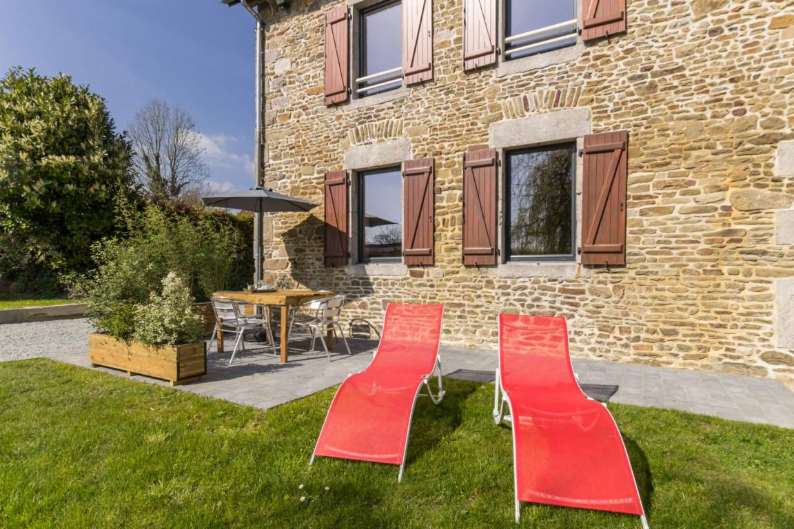 Doppelhaushälfte neben dem Wohnhaus der Eigentümer. Erdgeschoss: Eingang mit WC (Waschmaschine). Wohnzimmer (TV, ADSL-Internet). Kochnische (Induktionskochfeld, Mikrowelle, Backofen, Gefrierfach). Obergeschoss: Schlafzimmer 1 (1 Doppelbett 140x190 cm) mit Ankleidebereich. Schlafzimmer 2 (2 Einzelbetten 90x190 cm). Duschbad mit WC (Waschbecken, Duschkabine, Handtuchwärmer). Privater, nicht umzäunter Garten. Terrasse. Gartenmöbel. Sonnenliegen. Grill. Gemeinsame Schaukel und Sandkasten. Geschützter Teich auf dem Gelände. Parkplatz. Zentralheizung inklusive (Holzheizkessel). Alle Nebenkosten inklusive. Bettwäsche kann gemietet werden. Reinigungsservice auf Anfrage. Babyausstattung vorhanden. Ein weiteres Ferienhaus (9 Schlafplätze) befindet sich 80 m entfernt (Nr. G178). Partys und Feiern sind nicht gestattet.