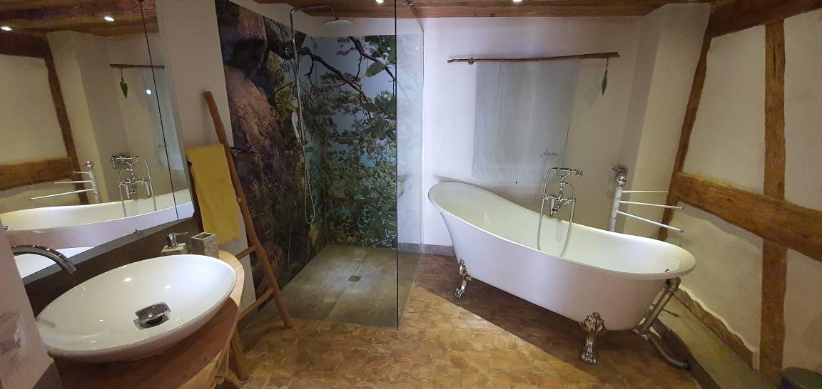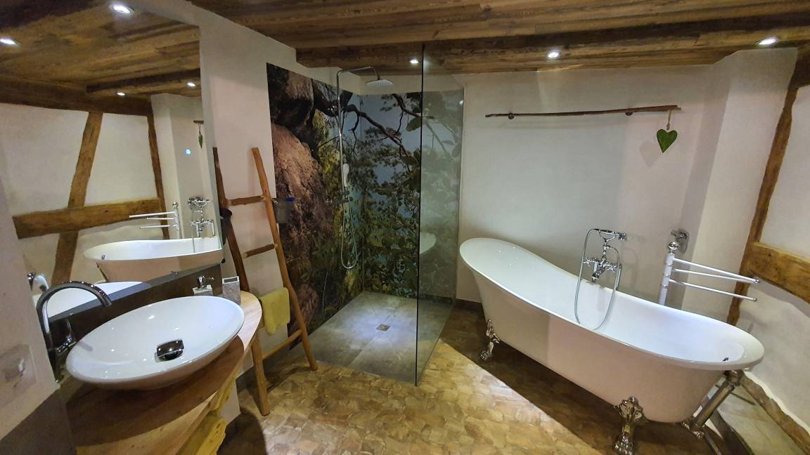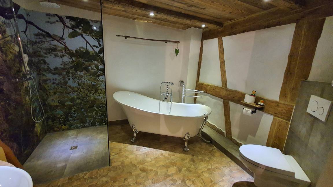 einem Bad mit Walk-in Dusche, freistehende Badewanne, Bluetooth Spiegel, Handtücher, Fön.....