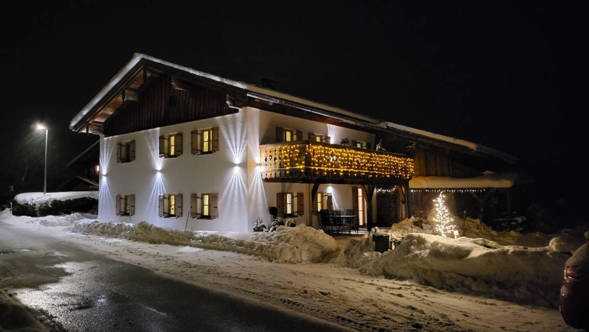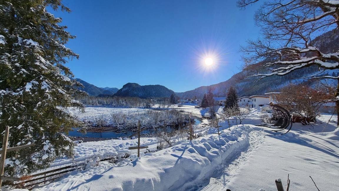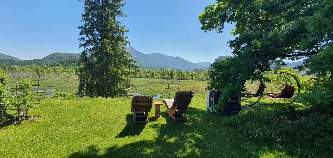 Die Ferienwohnung befindet sich im Erdgeschoß mit direkt anschließender, großzügiger Terrasse und Panoramablick auf die ersten, hohen Gipfel der nördlichen Alpen.