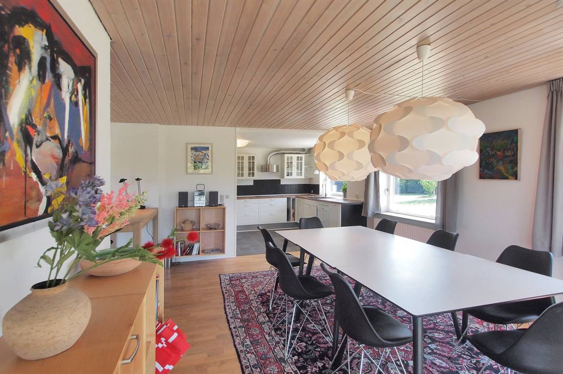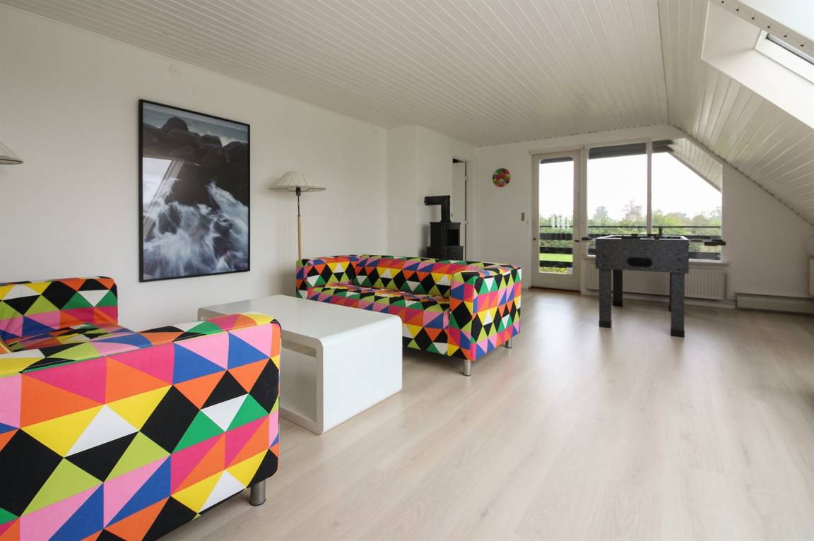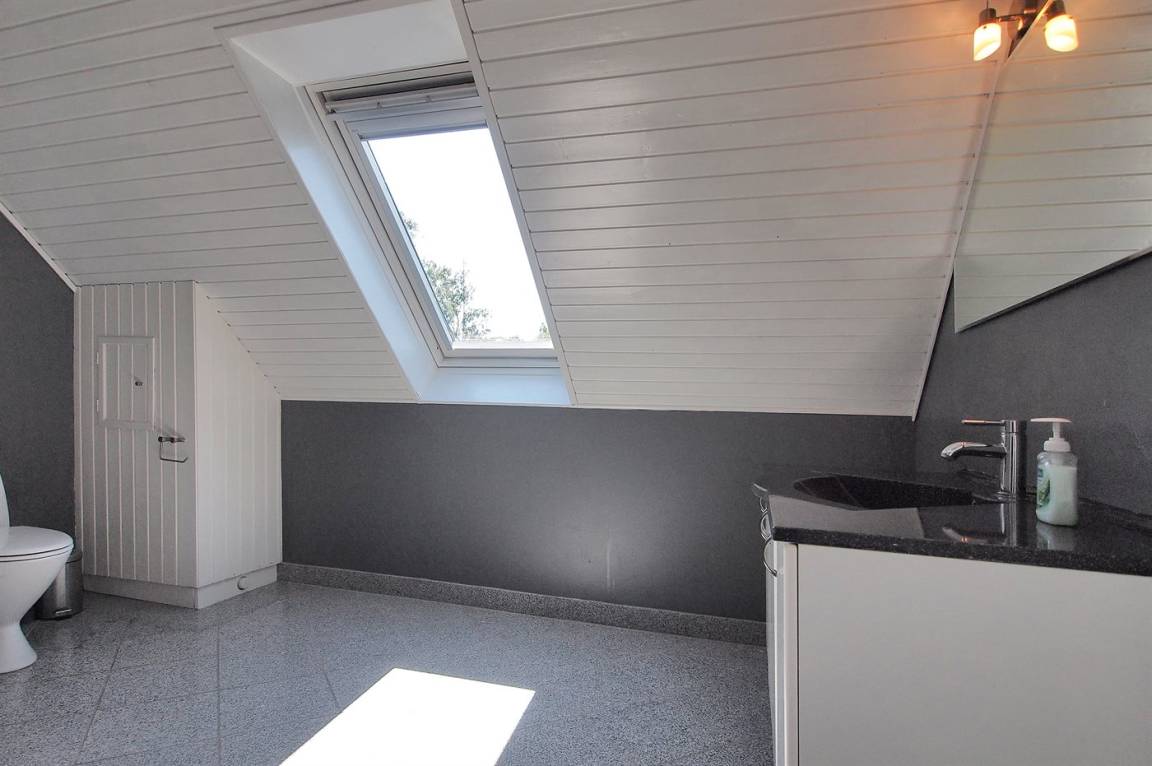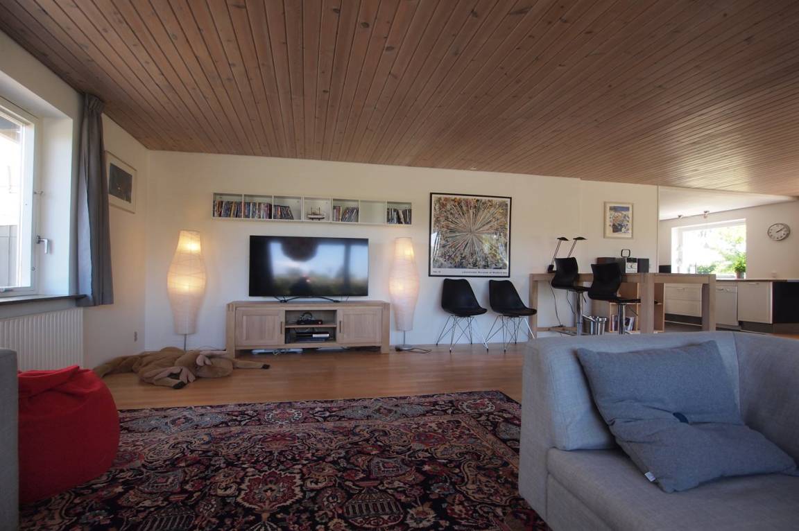 Das Haus ist großzügig und einladend. Im Erdgeschoss findest du eine große, offene Küche, einen Essbereich, ein Schlafzimmer sowie ein Wohnzimmer. Außerdem gibt es ein großes Badezimmer, und im Obergeschoss ein Gäste-WC. Du findest zudem fünf Schlafzimmer, wodurch das Haus optimal für eine große Familie geeignet ist – oder wenn du „zusammen und doch getrennt" wohnen möchtest. Vom Wohnzimmer aus gelangst du auf die große Terrasse und in den feinen Garten, wo die Kinder stundenlang spielen können. Hier findest du auch den Grill, auf dem du köstliche Mahlzeiten zubereiten kannst.