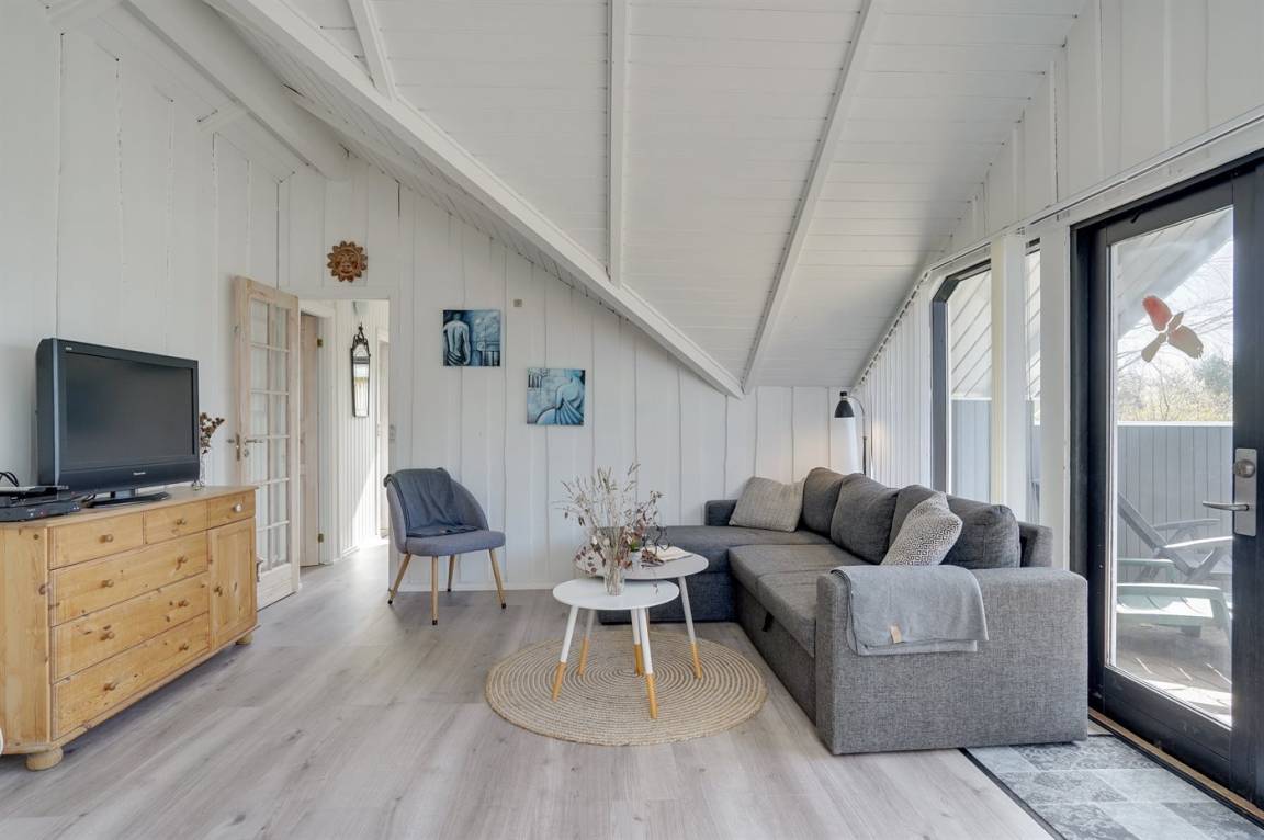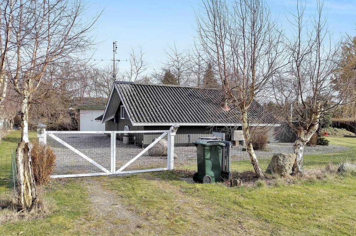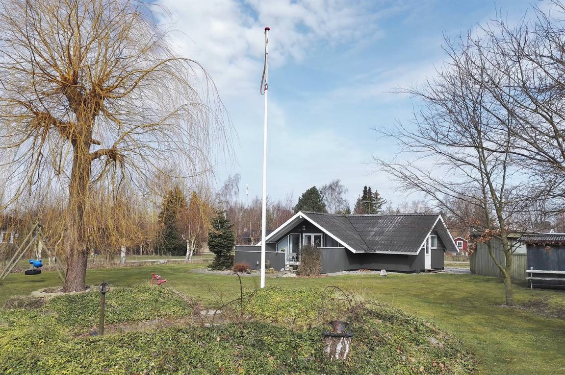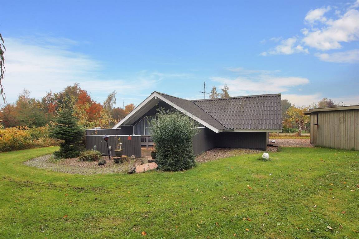 Ein gepflegtes Ferienhaus auf einem von Büschen und Bäumen umgebenen Grundstück gelegen – nicht weit von einem schönen Badestrand entfernt.