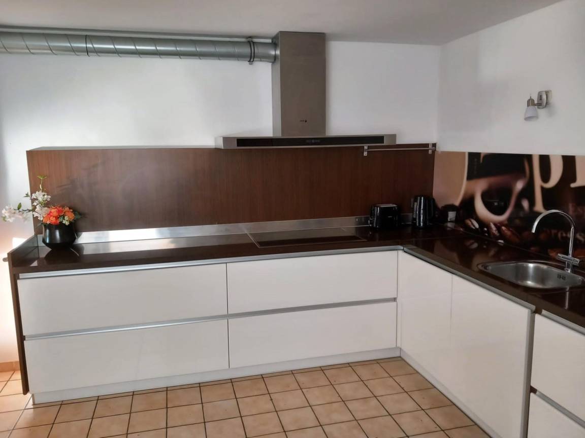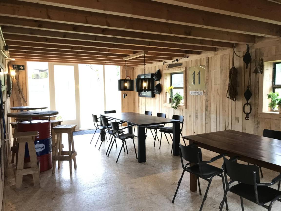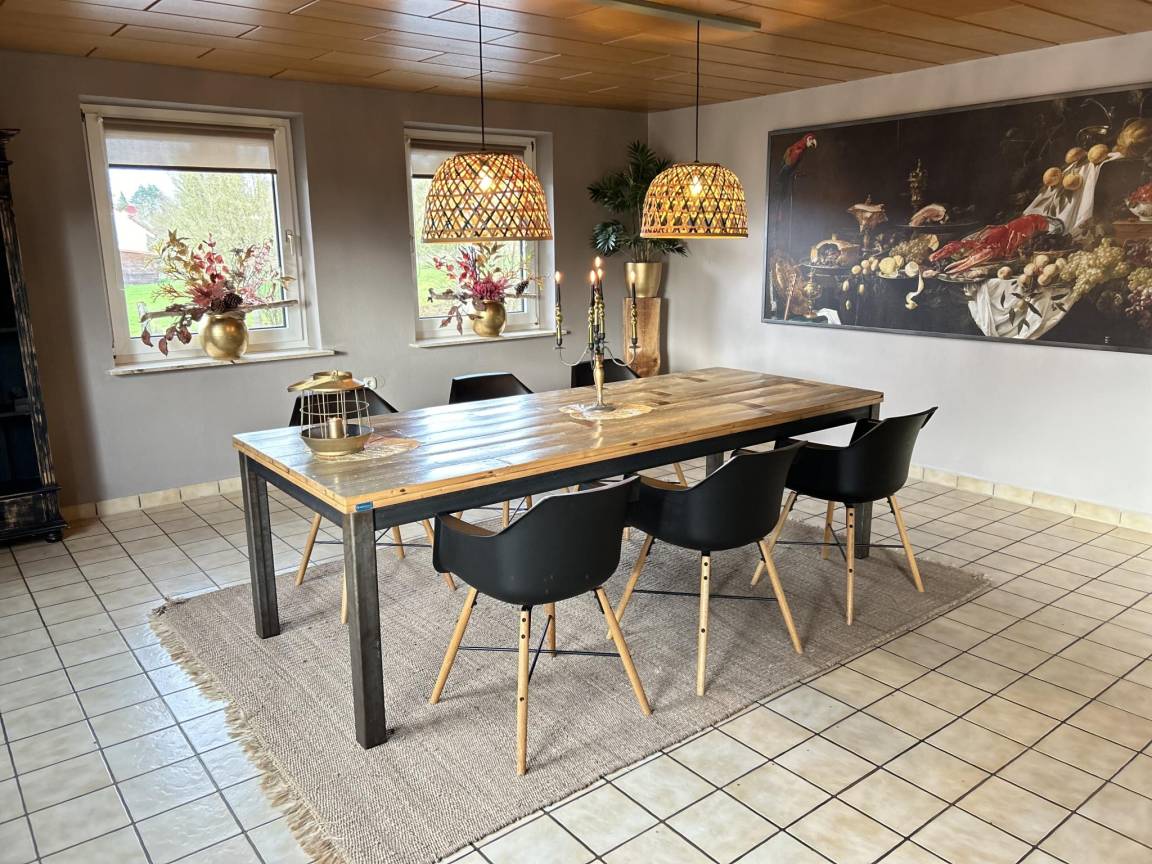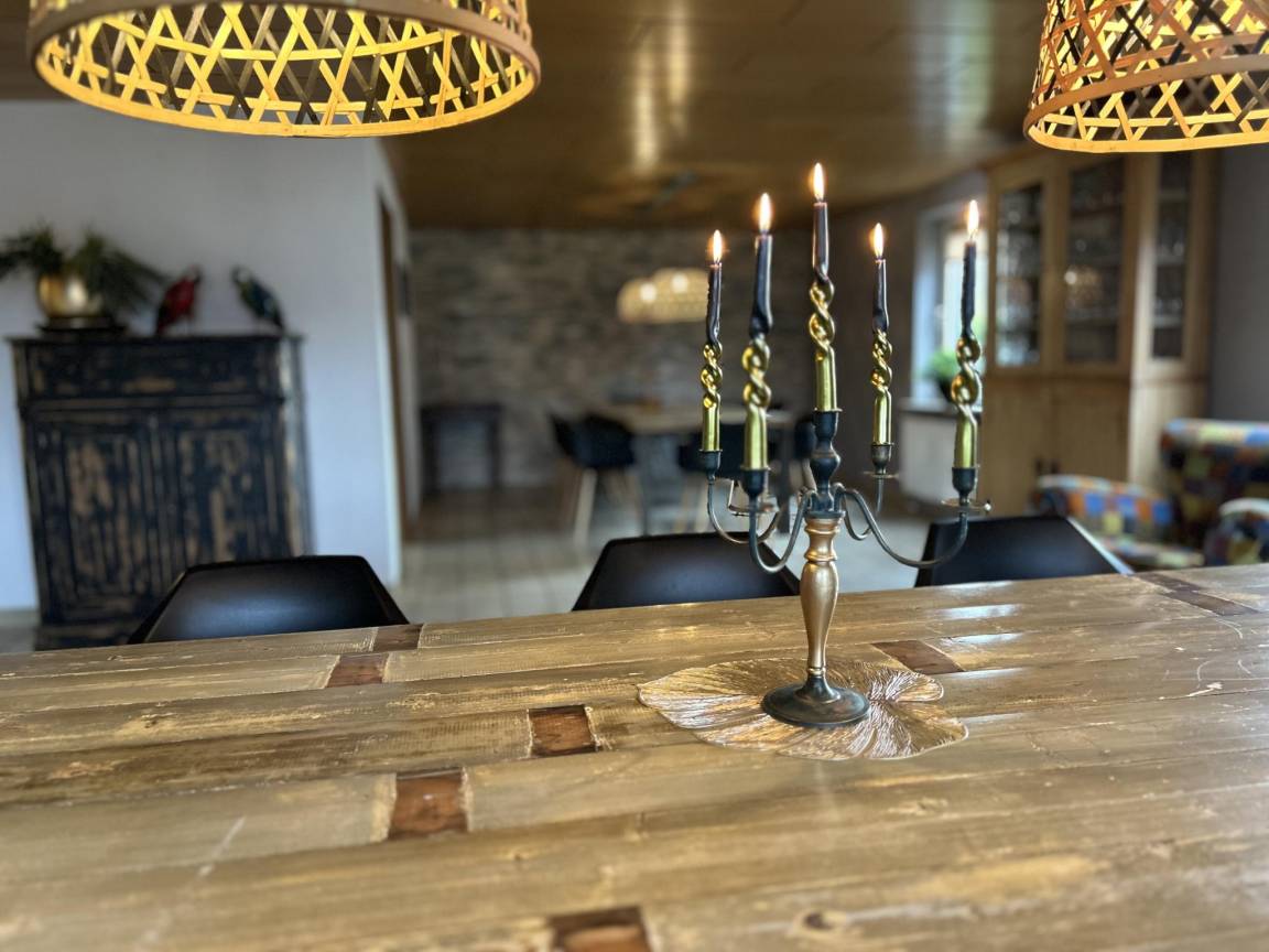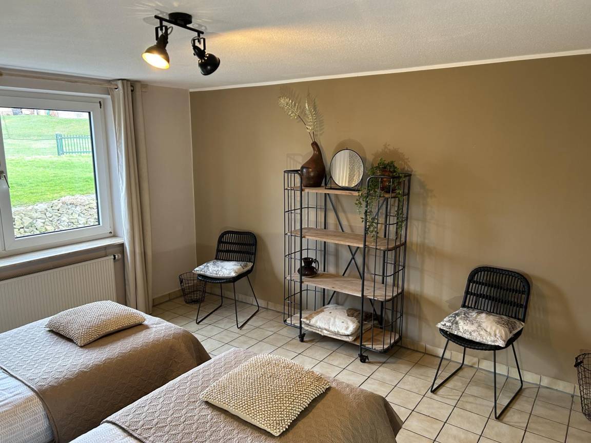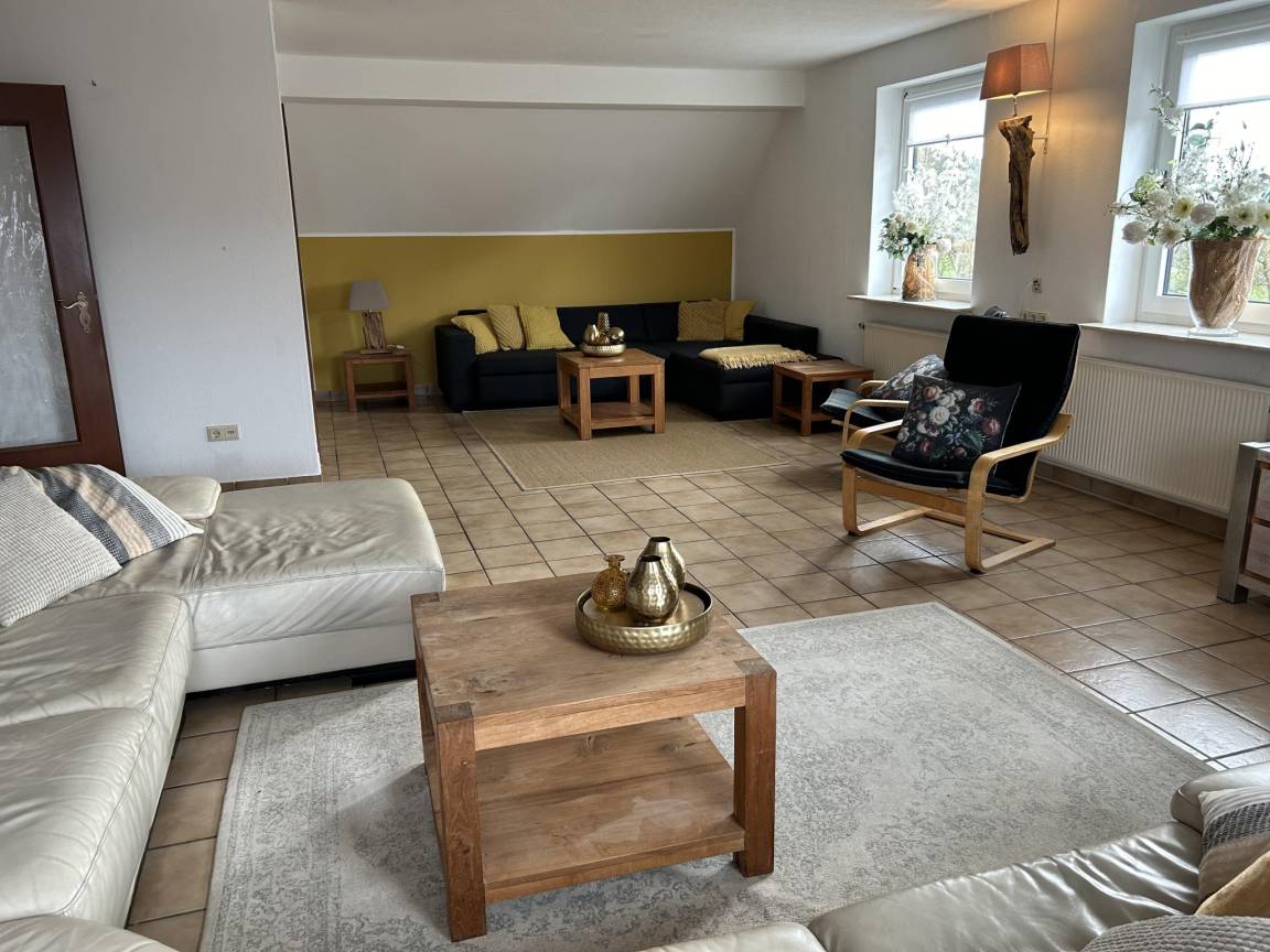 In der 1. Etage: Esszimmer mit 2x Esstisch(17 Personen) , Küche mit Wasserkocher, Toaster, Kochherd(4 Kochplatten, Ceranfeld), Dunstabzugshaube, Kaffeemaschine(Filter, pads), Backofen, Mikrowelle, Geschirrspüler, 2x Kühl-/Gefrierkombination, Stabmixer , Schlafzimmer mit 2x Einzelbett(90 x 200 cm), 1x Kinderbett (ohne Bettwäsche) , Schlafzimmer mit Einzelbett(90 x 200 cm) , Schlafzimmer mit 2x Einzelbett(90 x 200 cm) , Badezimmer mit Dusche, Waschbecken, Toilette , Toilette mit Waschbecken , Gemeinschaftsraum(über gemeinsamen Eingang, von außen erreichbar) mit 2x Esstisch(12 Personen), Dart