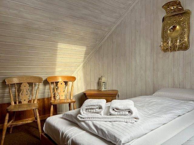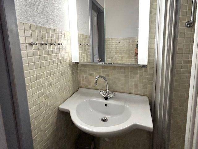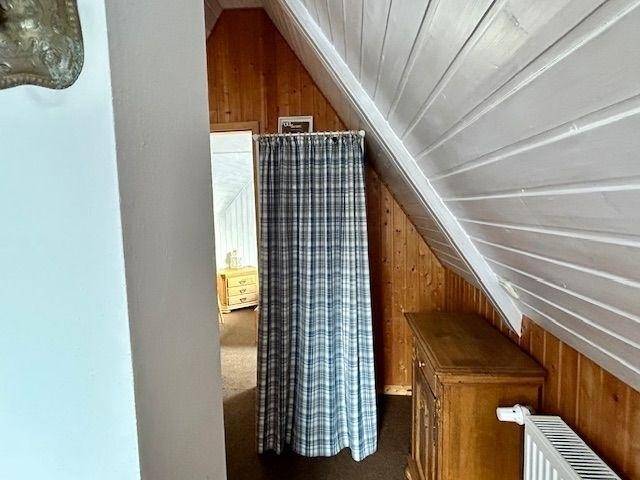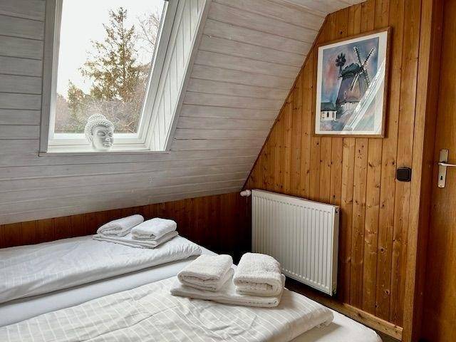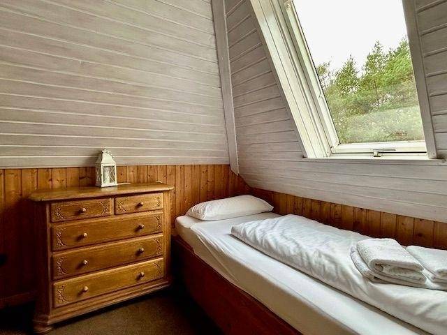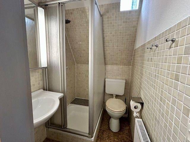 Das Badezimmer verfügt über eine Dusche (Einstieg 23 cm) und ein WC. Eine steile Raumspartreppe führt zu zwei Schlafzimmern: eines mit zwei Einzelbetten und das andere mit einem Doppelbett.