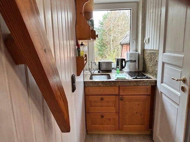 Das Ferienhaus Dünenrose in Nebel - Westerheide bietet eine gemütliche Maisonettwohnung für bis zu 4 Personen im Obergeschoss. Die Wohnung besticht durch ihre hellen Holzvertäfelungen und die stilvolle Einrichtung aus Eichenmöbeln im Bauernstil. Die kompakte Kochnische ist mit einem 2-Platten Herd und einem kleinen Kühlschrank ausgestattet. Ein einladender Essbereich mit Friesenporzellan lädt zum Verweilen ein.