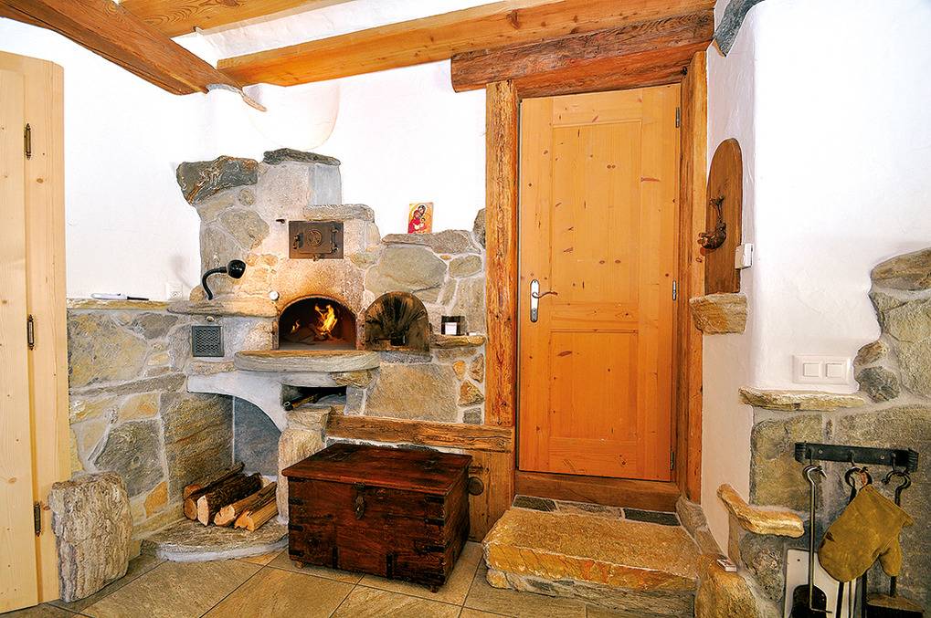 Parterre: Schöner Wohn-/Schlafraum mit originaltypischem Pizzaofen, Kaminofen, gemütlicher Sitzgruppe (Schlafsofa 2 Pers.), Sat-TV, Esstisch, moderner Küchenzeile (Dampfgarer, Spülmaschine). Doppelzimmer. Bad: Wellness-Dusche, Wb. Separates WC.