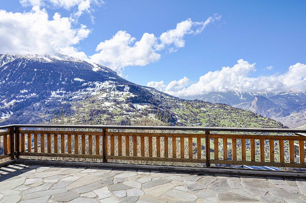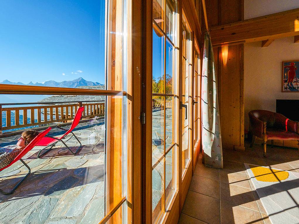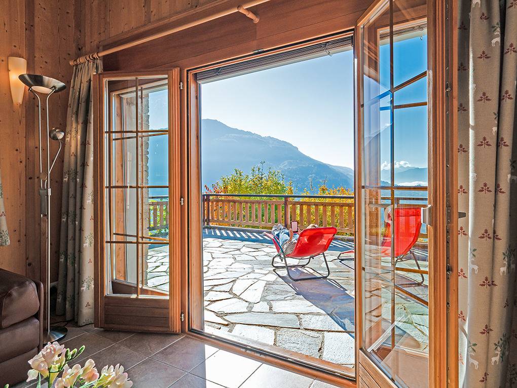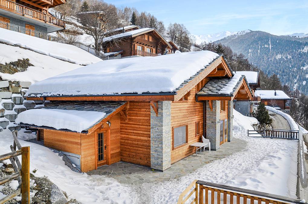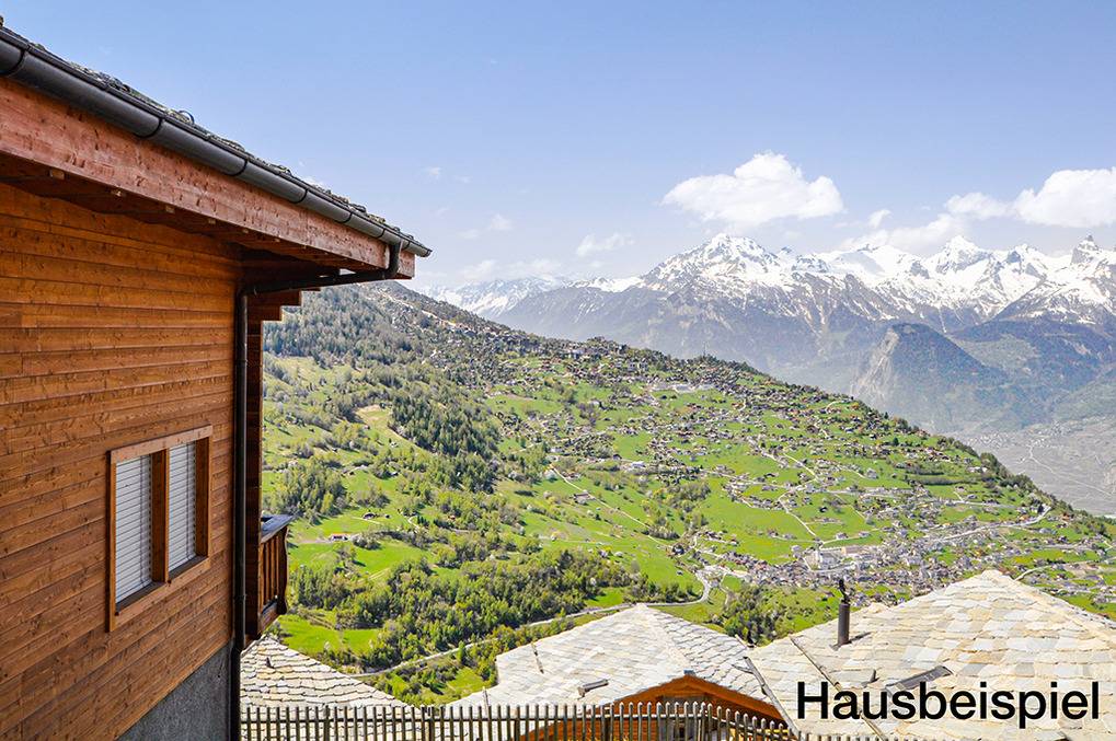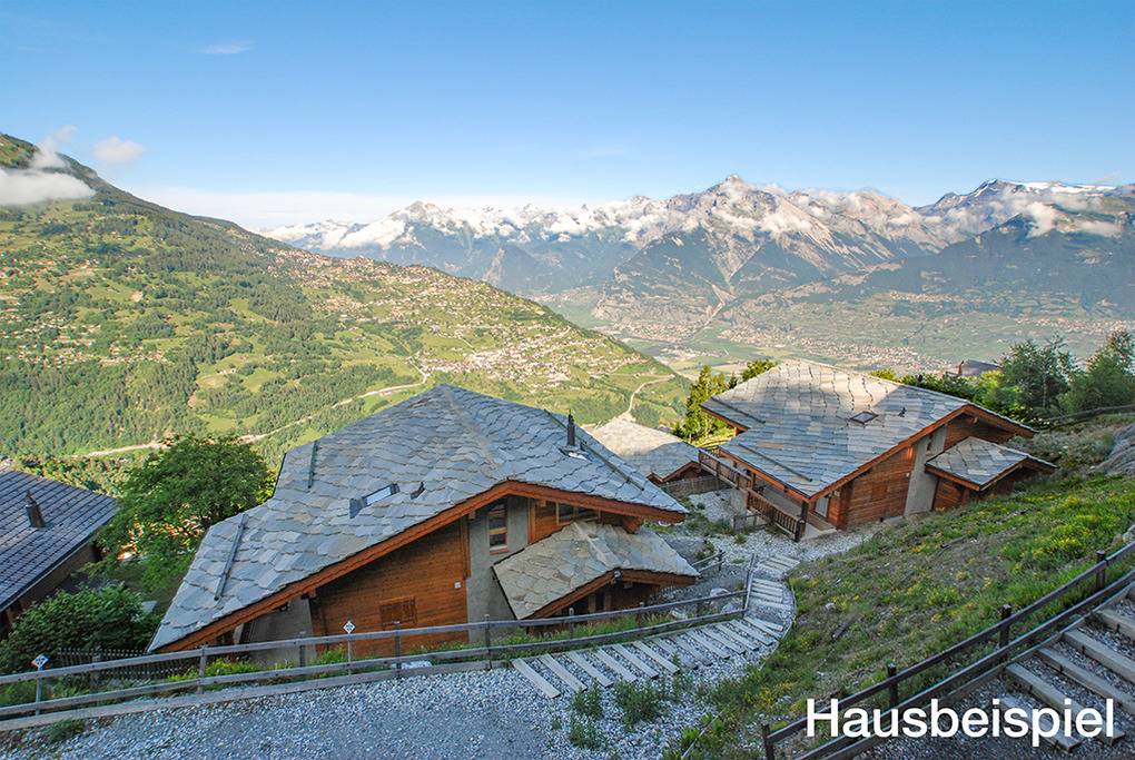 Ort: Veysonnaz. Chaletsiedlung in exponierter, sonniger Süd-West-Lage oberhalb des Ortes. Herrlicher Blick ins Rhône-Tal. Gondelbahn mit Ski-Schränken ca. 1,5 km (zu Fuß 900 m). Skibus 700 m. Ortsmitte 1 km. Pkw Zufahrt bis zum Haus (je nach Schneelage auf den letzten 200 m nur mit guter Winterausrüstung).