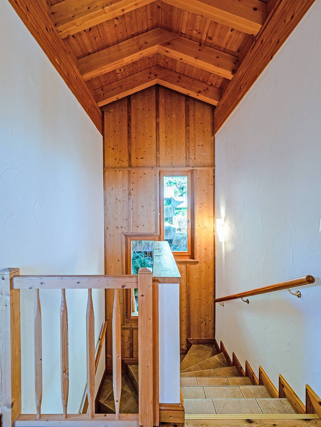 Parterre: Flur mit Garderobe. Sehr schöner, großzügig bis in den Dachgiebel ausgebauter Wohnraum (45 qm) mit Panoramafensterfront, gemütlicher Sitzecke am Kamin, Kabel-TV, Radio/CD, großem Esstisch, moderner Küchenzeile (Backofen, Mikrowelle, Spülmaschine). Doppelzimmer. 1-Bettzimmer mit Schreibtisch, Monitor. Bad: Dusche, Wb, WC.