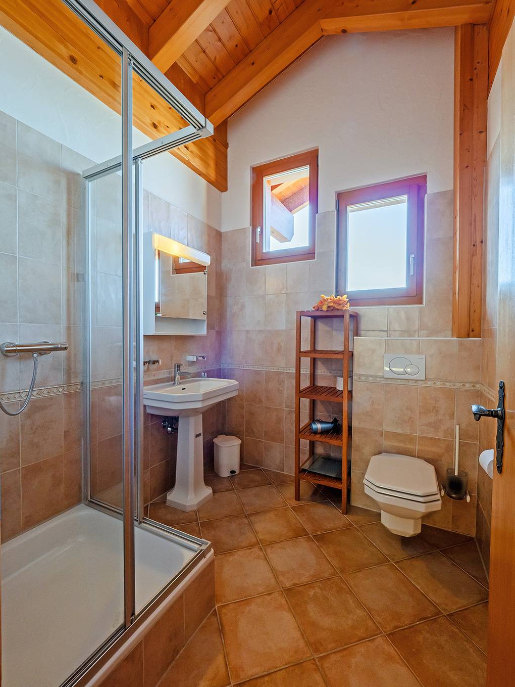 Haus: Sehr schönes Komfort-Chalet mit Kamin. 6-Zimmer-Haus mit 150 qm Wohnfläche über zwei Etagen. 5 Schlafräume, 3 Bäder! Sehr hochwertige, geschmackvolle Einrichtung. Helle, offene Konstruktion mit großen Fensterfronten und schönem Bergblick. Internet kostenlos über W-Lan. Waschmaschine, Trockner. E-Heizung, teils Fußbodenheizung. Nichtraucherhaus. Sehr große Terrasse mit Sitzmöbeln, Grillkamin. Garage für einen Pkw am Haus, zwei weitere Pkw-Stellplätze in Hausnähe (150 m).