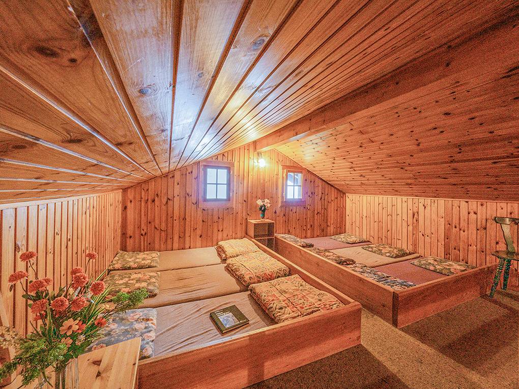 2. Etage: Ausgebautes Dachgeschoss mit Schrägen. Großer Schlafraum mit 2 Einzelbetten, Matratzenlager für 6 Pers. (Stehhöhe max. 1,80 m).