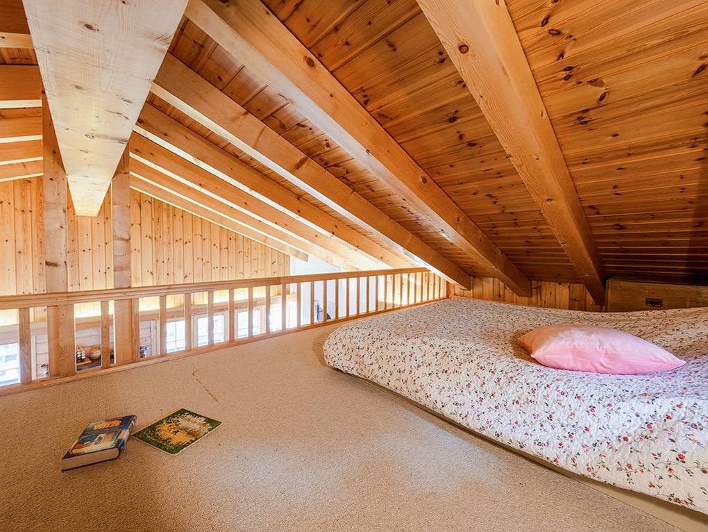 1. Etage: Eingang, Windfang. Schöner bis zum Dachgiebel ausgebauter Wohnraum (40 qm) mit Kamin, Couchgarnitur, Sat-TV, Esstisch, neuer Einbauküche (Backofen, Spülmaschine). Bad: Du, Wb, WC. Vom Wohnraum schmale Treppe auf Mezzanine mit 2 Matratzen unter dem Dachgiebel (max. 1,60 m Höhe).