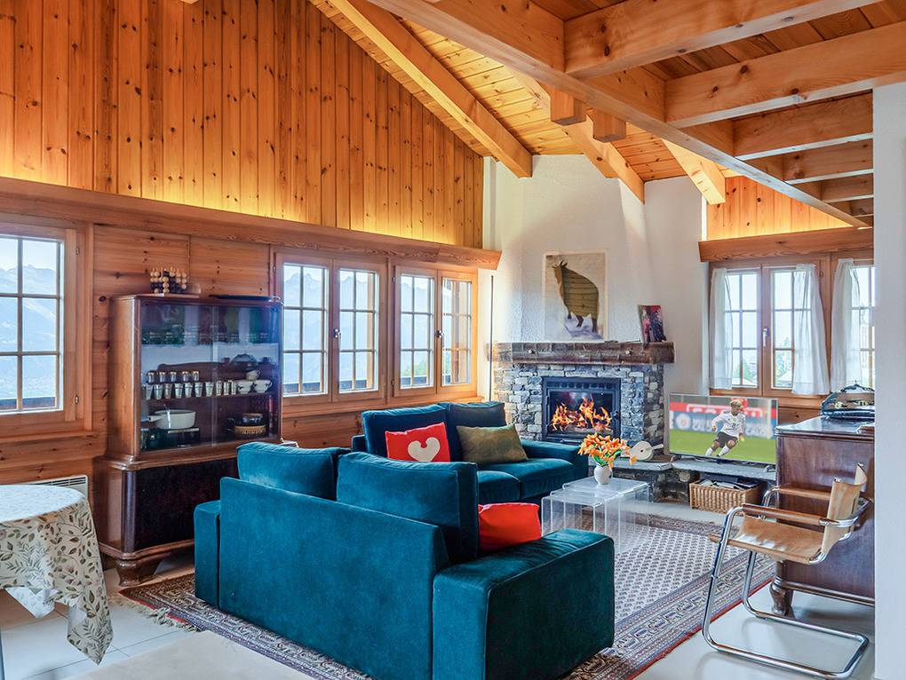Haus: Sehr schönes Walliser Chalet mit Kamin. Großzügiges 4-Zimmer-Haus mit ca. 120 qm Wohnfläche über 2 Etagen. Großes Platzangebot, gemütliches Ambiente durch Holzvertäfelung. Internetzugang über W-Lan. E-Heizung. Warmwasser über 200 l E-Boiler. Großer Balkon. Garage.