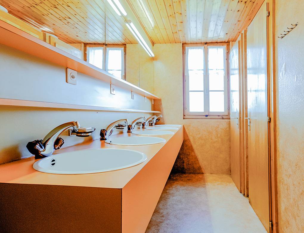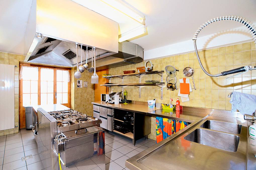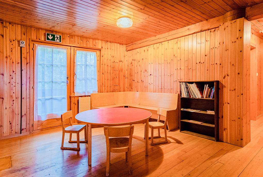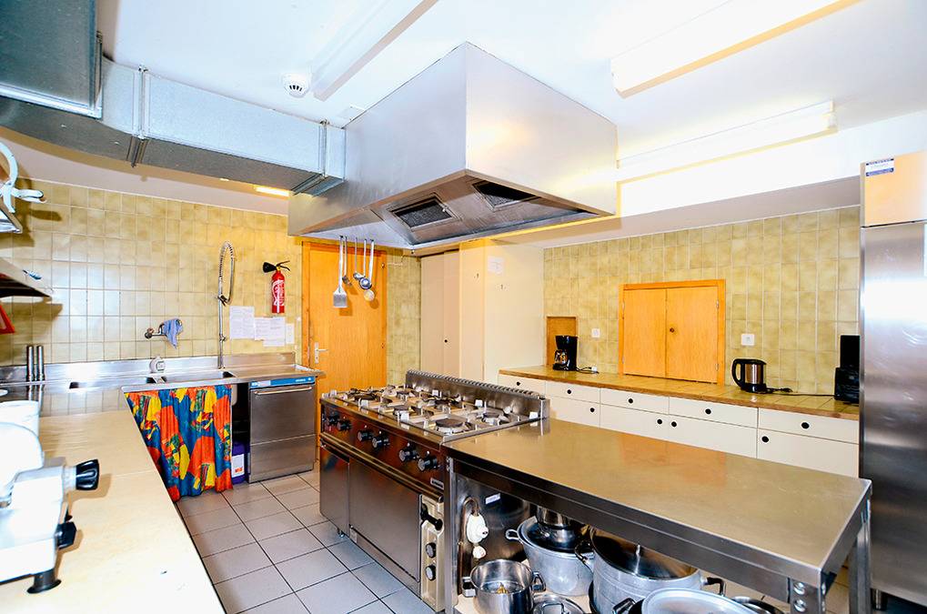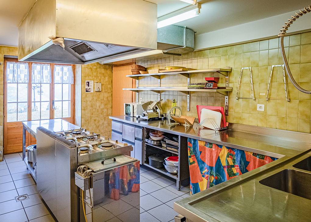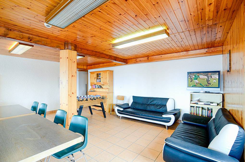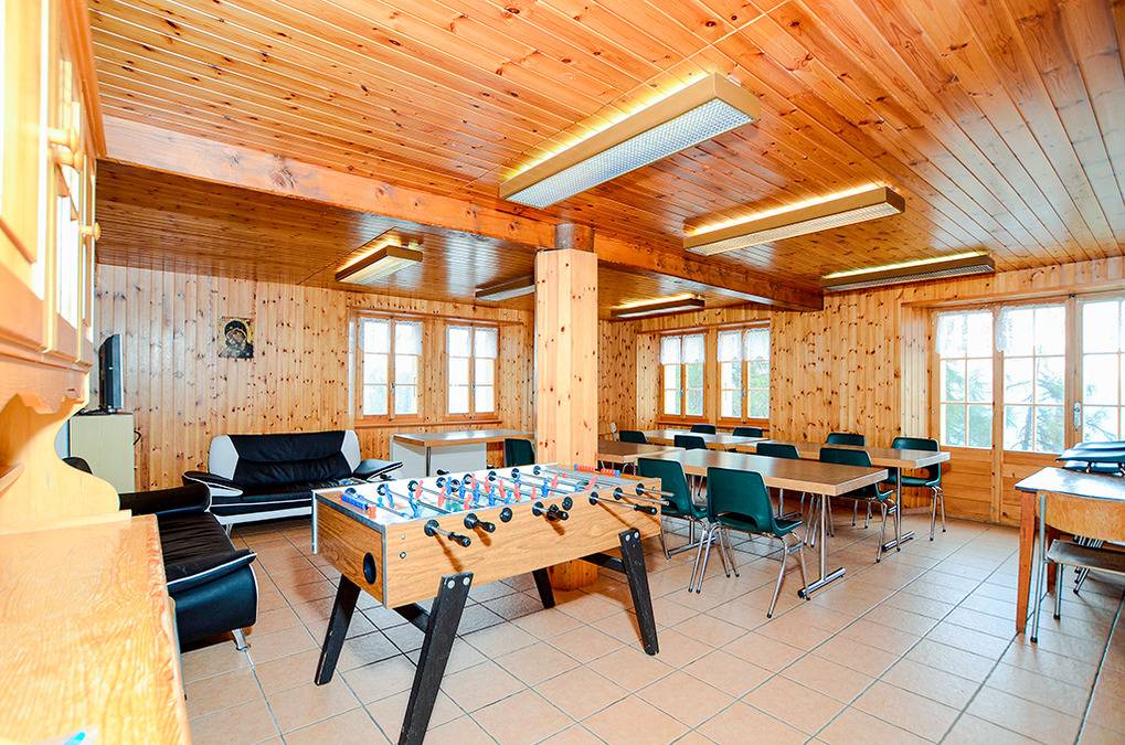 Parterre: Vorraum mit Skischuhregal, Garderobe. Großer gemütlicher Tagesraum (42 qm) mit Esstischen, Sitzecke, TV, Kicker. Hotelküche mit Spülmaschine. Kühler Vorratsraum mit Tiefkühltruhe. 2 separate WC.
