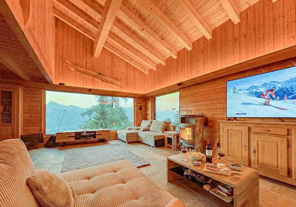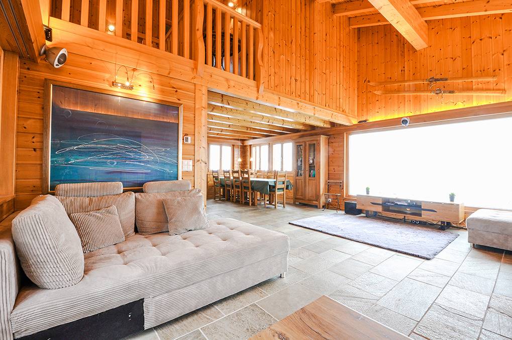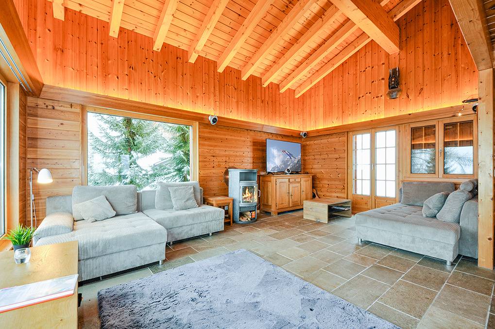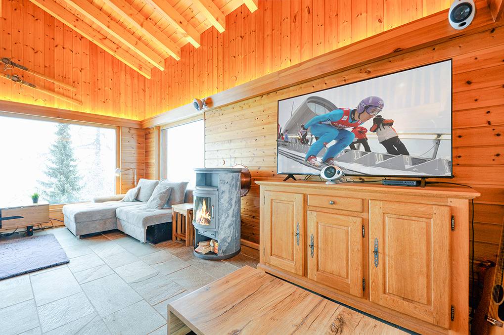 1. Etage: Großer, heller Wohnraum (65 qm !) mit Panoramafenstern, Kaminofen, gemütlicher Sofa-Sitzgruppe, Flachbild-Smart-TV, Esstisch, Einbauküche (Backofen, Mikrowelle, Spülmaschine). Große Terrasse mit Sitz- und Liegemöbeln, Trampolin, einzigartigem Bergblick.