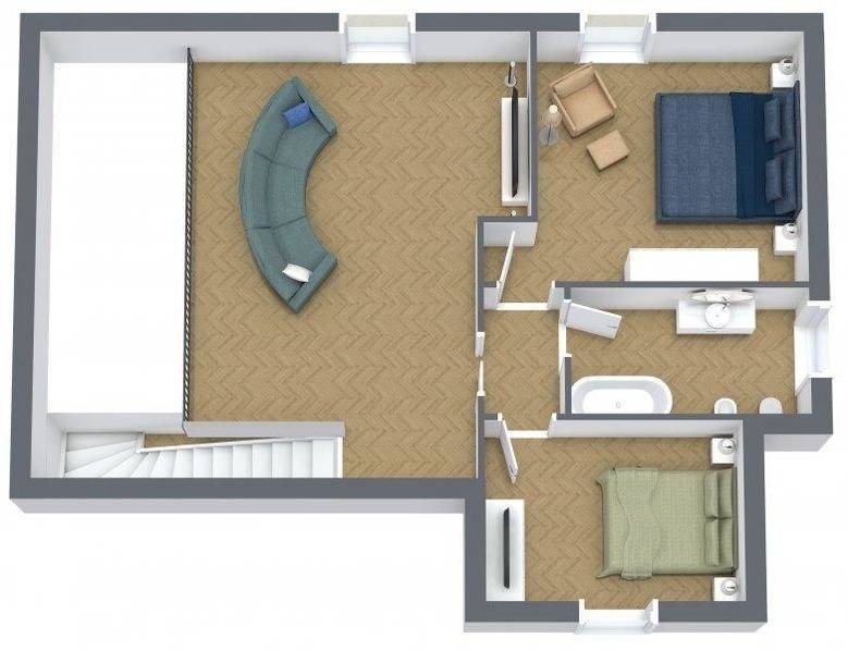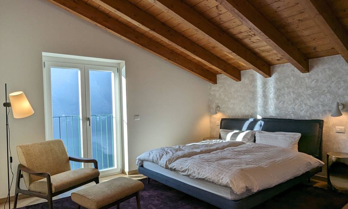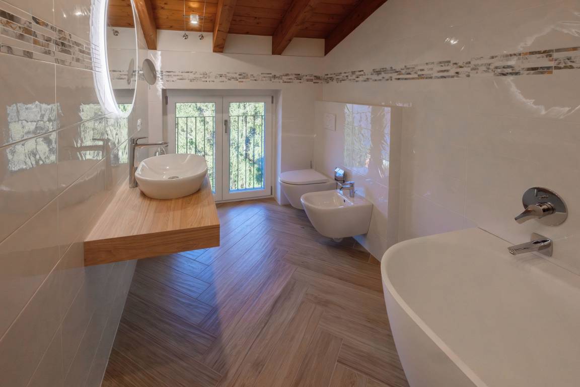 Im Dachgeschoss befinden sich zwei weitere Doppelzimmer, ebenfalls eines mit Blick auf den See und das andere mit Blick in den Wald. Das Bad auf dieser Etage verfügt über eine Badewanne sowie WC, Bidet und Waschbecken.