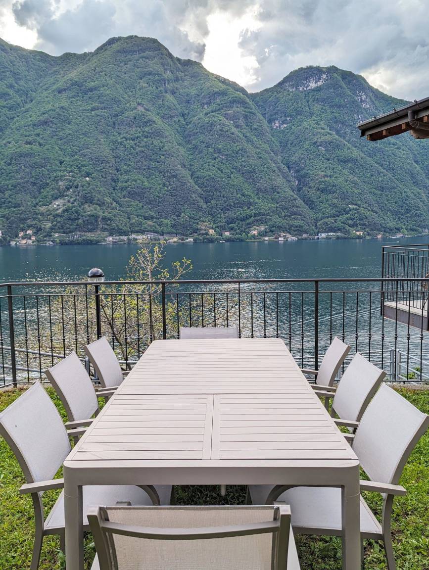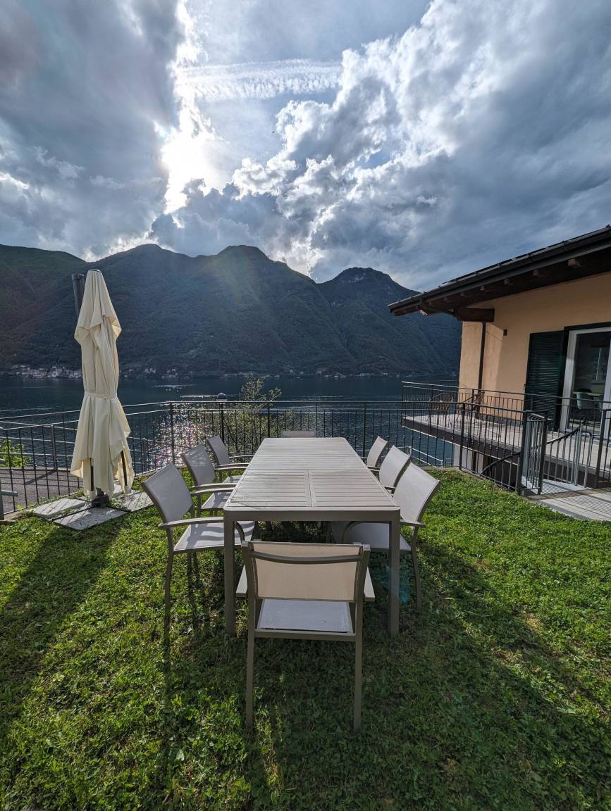 Rund um die Villa gibt es einen großzügigen, vollständig eingezäunten Garten auf mehreren Ebenen. Von allen Bereichen haben Sie einen einzigartigen Blick auf den Comer See. Auf der Erdgeschossebene befindet sich eine Terrasse mit Esstisch für 8 Personen. Vor dem Haus gibt es eine Rasenfläche mit Liegen und Deckchairs.