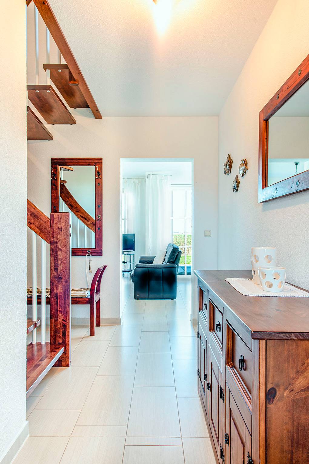 D 128.38A Ferienhaus 2-5 Pers.: 4-Zimmerhaushälfte mit ca. 80 qm Wohnfläche. Parterre: Ansprechender Wohn-/Essraum mit Couchgarnitur, Sat-TV, DVD, Radio-CD, Esstisch, Einbauküche (Backofen, Spülmaschine, Mikrowelle). Bad/WC. 1. Etage: Doppelzimmer. Einzelzimmer. Bad/WC.