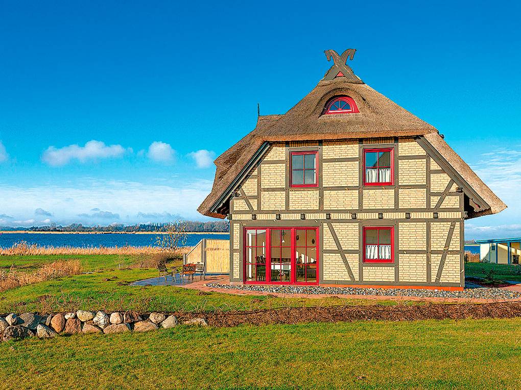 Haus: Schönes, neu erbautes Doppelhaus mit Reetdach. Es beherbergt zwei komfortable Haushälften mit fantastischem Wasserblick auf den Breetzer Bodden. Jede Haushälfte mit geschmackvoller Möblierung. Fußbodenheizung. Terrasse mit Boddenblick, Sitzmöbeln. Garten (450 qm) mit Rasenfläche. 1 Pkw-Stellplatz/Haushälfte.
