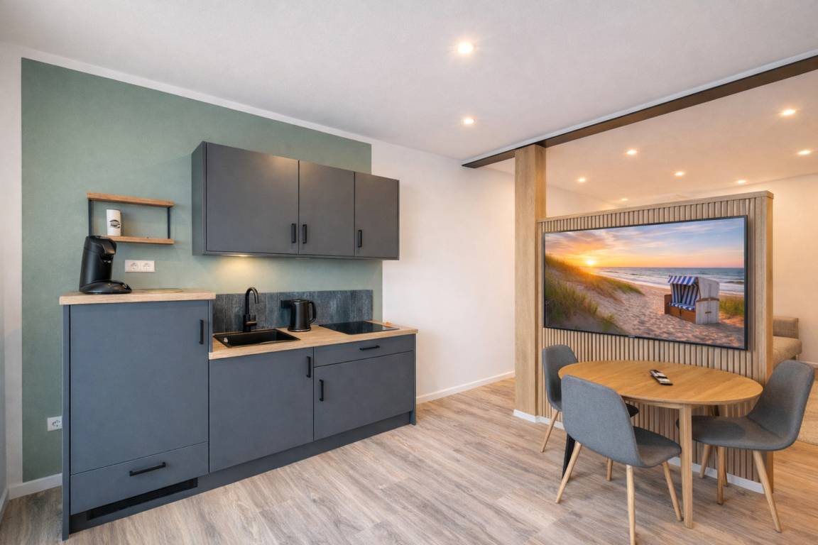 Im großzügigen Wohnbereich können Sie nach einem Tag am Meer die Füße hochlegen, ein gutes Buch lesen oder gemeinsam den nächsten Ausflug planen. Für den perfekten Start in den Tag oder die kleine Pause zwischendurch steht Ihnen eine praktische Küchenzeile zur Verfügung. Sie ist ideal ausgestattet für ein gemütliches Frühstück, kleine Snacks oder die Zubereitung von Tee und Kaffee - so gestalten Sie Ihren Urlaub ganz nach Ihren Wünschen und sind völlig unabhängig. Am Esstisch genießen Sie Ihre Mahlzeiten und lassen den Tag entspannt ausklingen.
