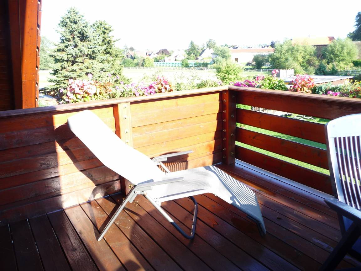 -ein gemütliches, ebenfalls im Landhausstil eingerichtetes Wohnzimmer, mit LED - TV u. DVD, daran angeschlossen ein großer Balkon auf dem man sich so richtig erholen kann, in Südlage, d.h. den ganzen Tag Sonne (wenn sie denn scheint), mit Liegestühlen und einem Tisch mit 4 Stühlen