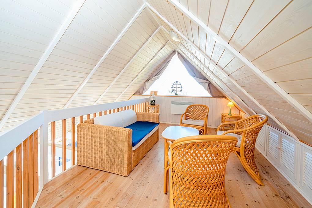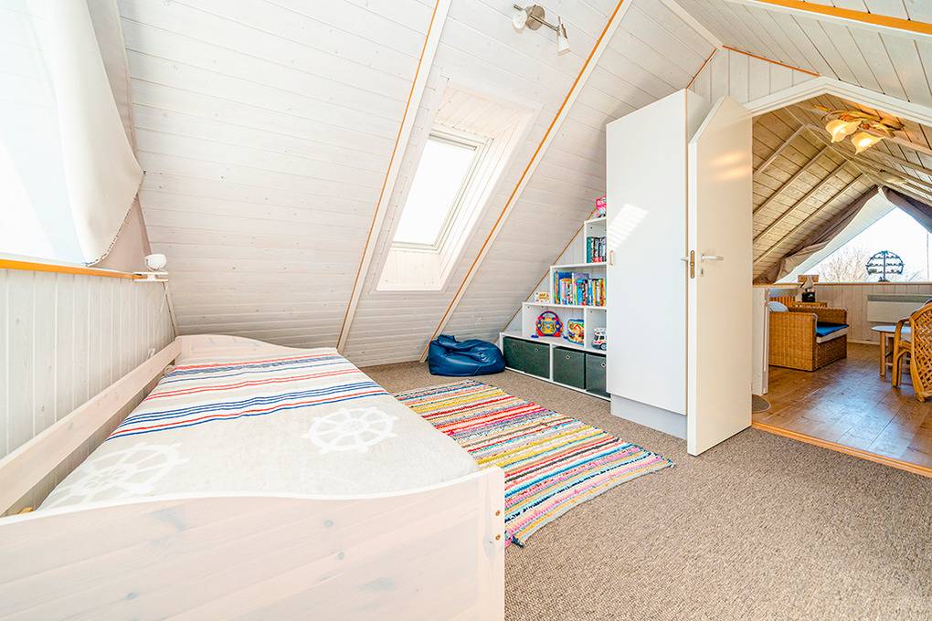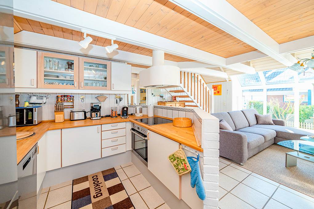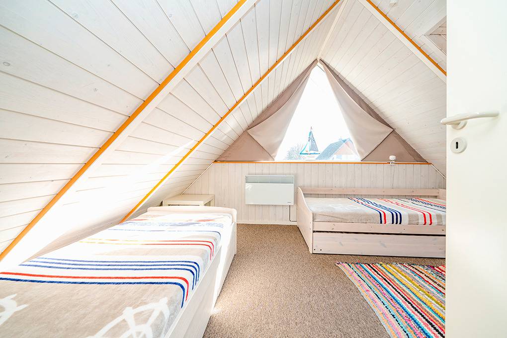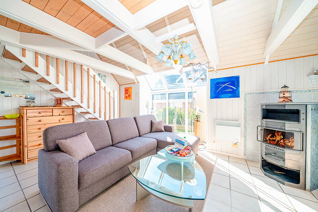 D 151.70 Ferienhaus 2-4 Pers.: 3-Zimmerhaus mit 78 qm Wohnfläche über 2 Etagen. Heller Wohn-/Essraum mit Kaminofen, Couchgarnitur, Flachbild-Smart-TV, Radio/CD, Esstisch, thekenartig abgetrennte Küchenzeile (Backofen, Mikrowelle, Spülmaschine). Doppelzimmer. Bad: Du, Wb, WC, Waschmaschine. Treppe ins ausgebaute Dachgeschoss: Galerie, offen zum Wohnraum, mit gemütlicher Sitzecke. 2-Bettzimmer mit Einzelbetten.