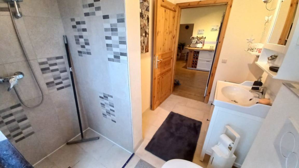 Im Erdgeschoss befindet sich auch ein Schlafzimmer mit einem Doppelbett sowie ein schönes, helles Bad mit bodentiefer Dusche.