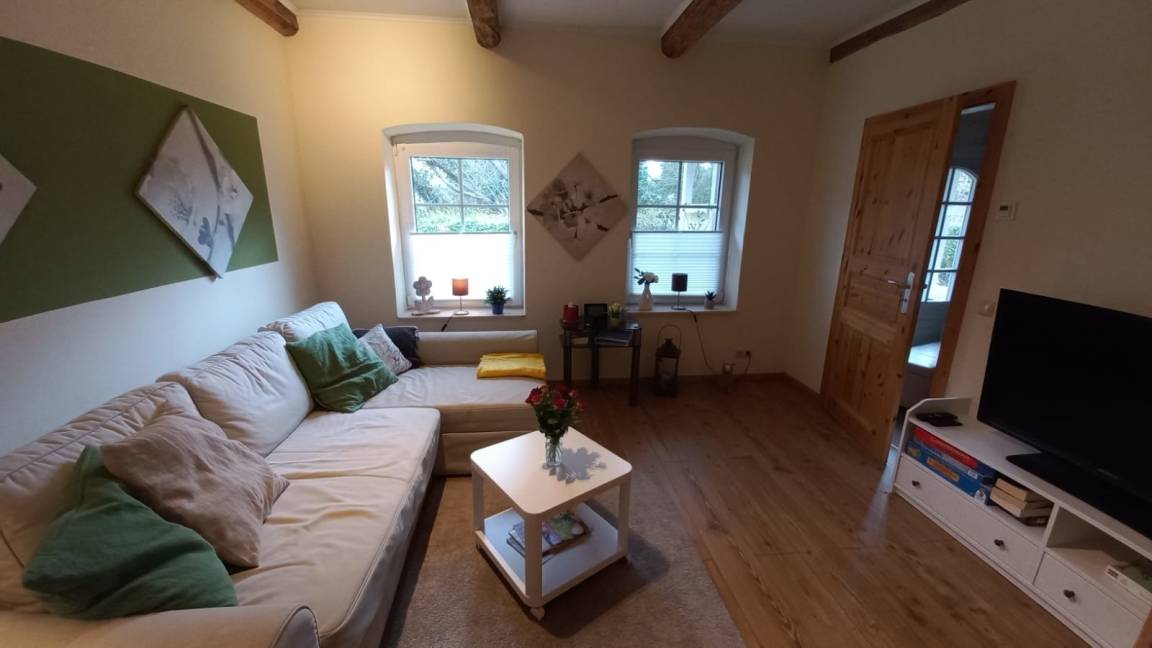 Entspannen können Sie sich im Wohnzimmer auf der großen Couch vor dem Flachbildfernseher.