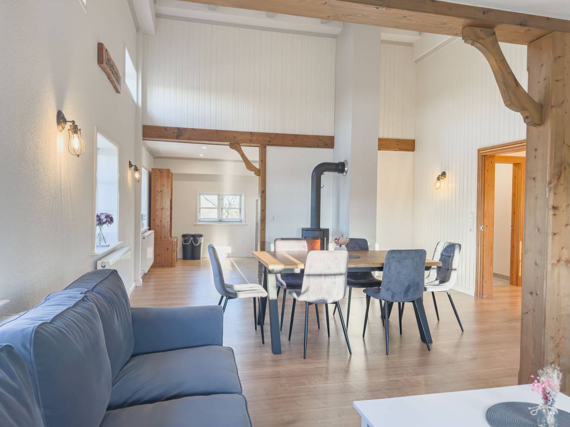 Der offen gestaltete Wohn- und Essbereich mit eindrucksvoller offener Balkenlage verleiht dem Wohnzimmer eine besondere Weite und ein warmes, wohnliches Ambiente.
