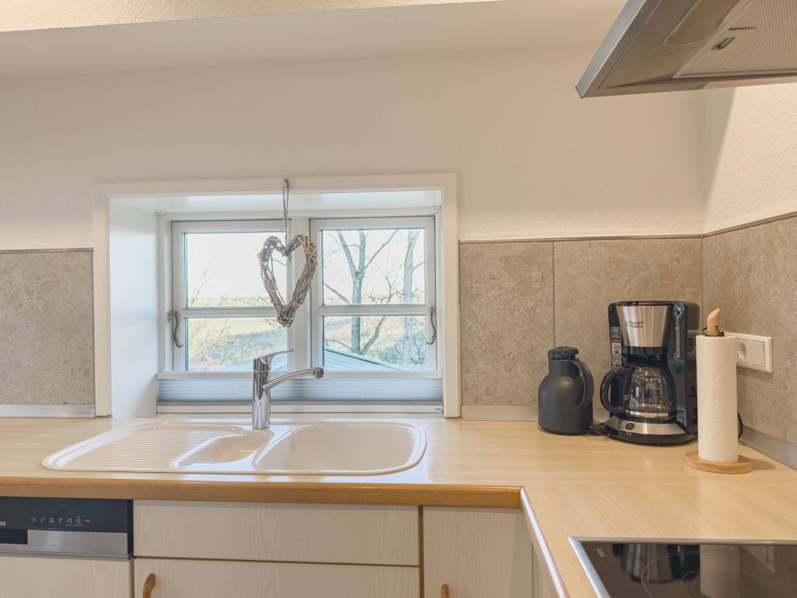 Die moderne, helle Küche ist harmonisch integriert und lädt zum gemeinsamen Kochen, Genießen und Verweilen ein.