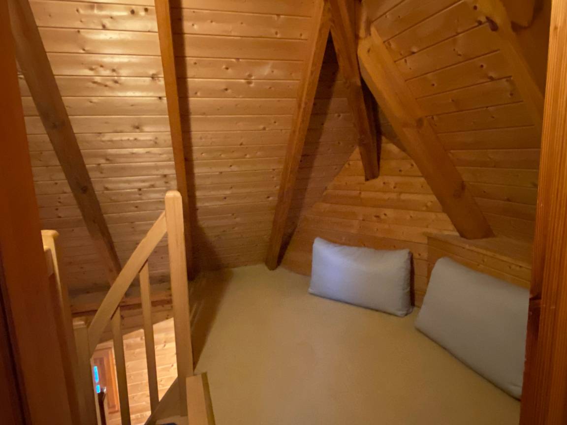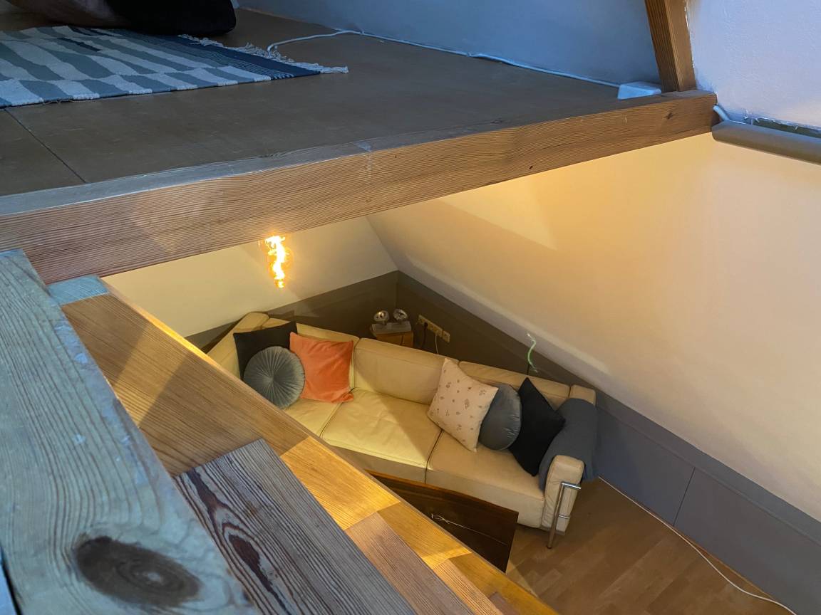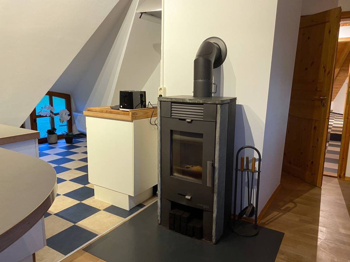 Diese besteht aus einem großzügigen Wohnzimmer mit Essbereich, Empore und einer Küche. Mittig steht ein Kaminofen.