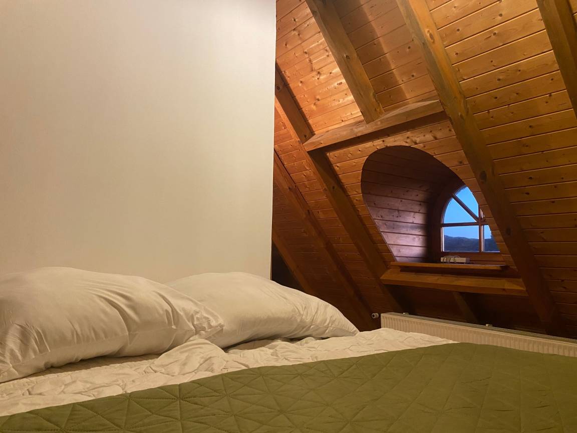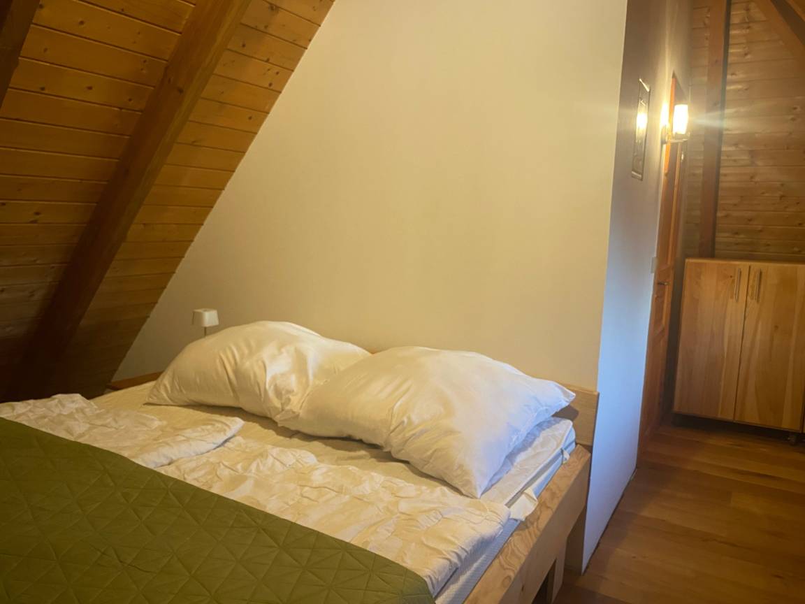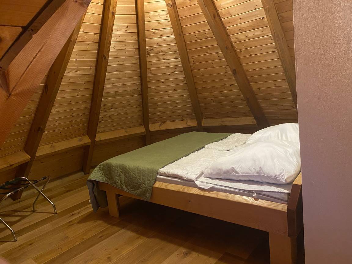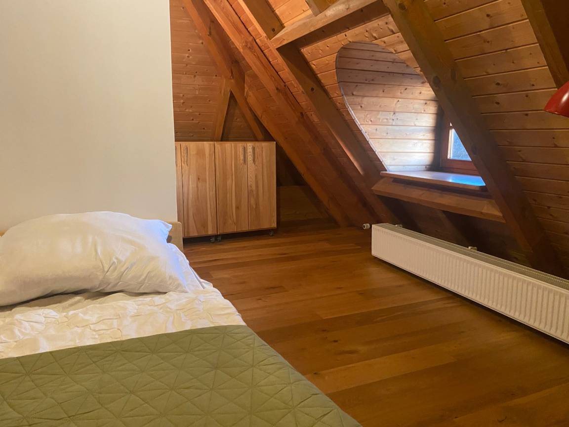Diese besteht aus einem großzügigen Wohnzimmer mit Essbereich, Empore und einer Küche. Mittig steht ein Kaminofen.