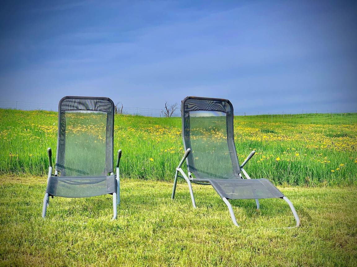 Wir stellen Sitzbänke, einen Sonnenschirm und Sonnenliegen bereit.