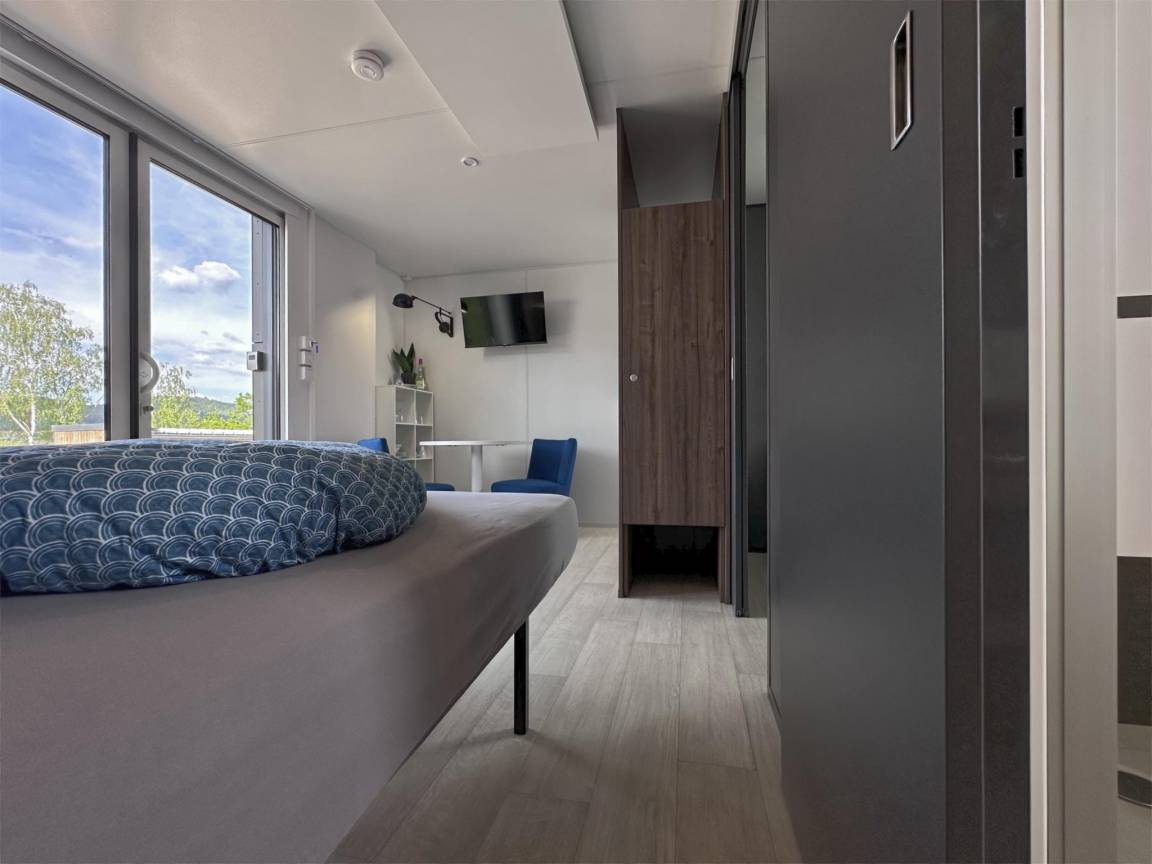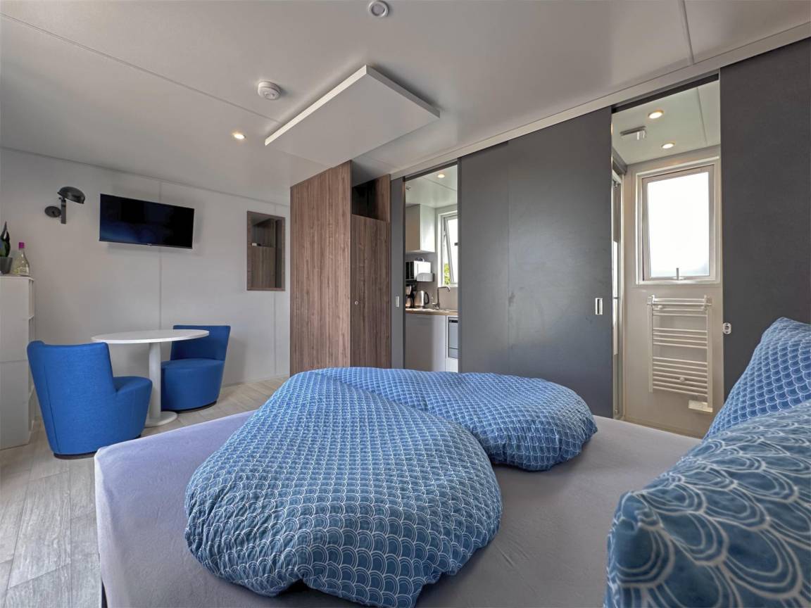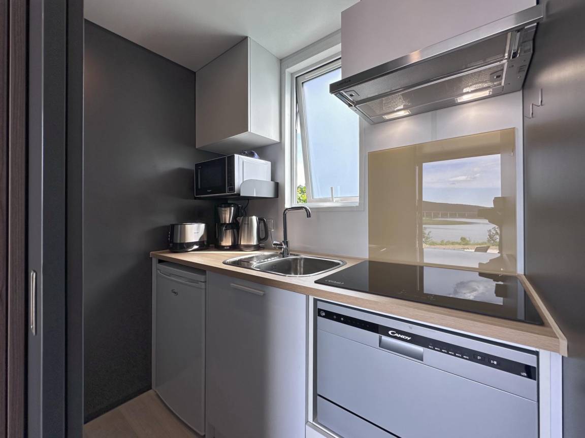 Layout : Parterre: Küche mit Wasserkocher, Toaster, Kochherd(4 Kochplatten, Induktion), Dunstabzugshaube, Kaffeemaschine(Filter), Mikrowelle, Geschirrspüler, Kühlschrank(+ Gefrierfach) , Wohn-/Schlafzimmer mit Doppelbett(Zwei Einzelbettdecken, 160 x 200 cm), TV(Flatscreen, Satellit, smart TV), Esstisch(2 Personen) , Badezimmer mit Waschbecken, Dusche , Toilette mit Toilette