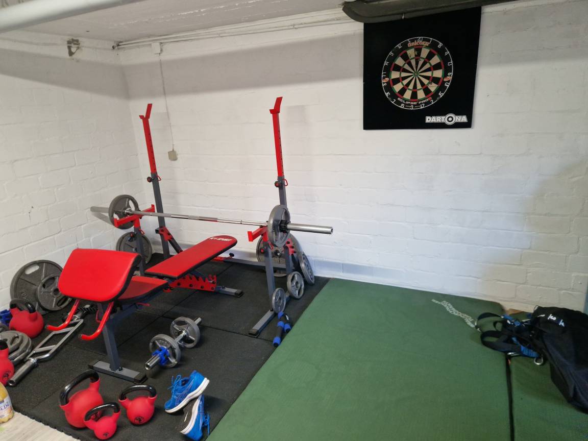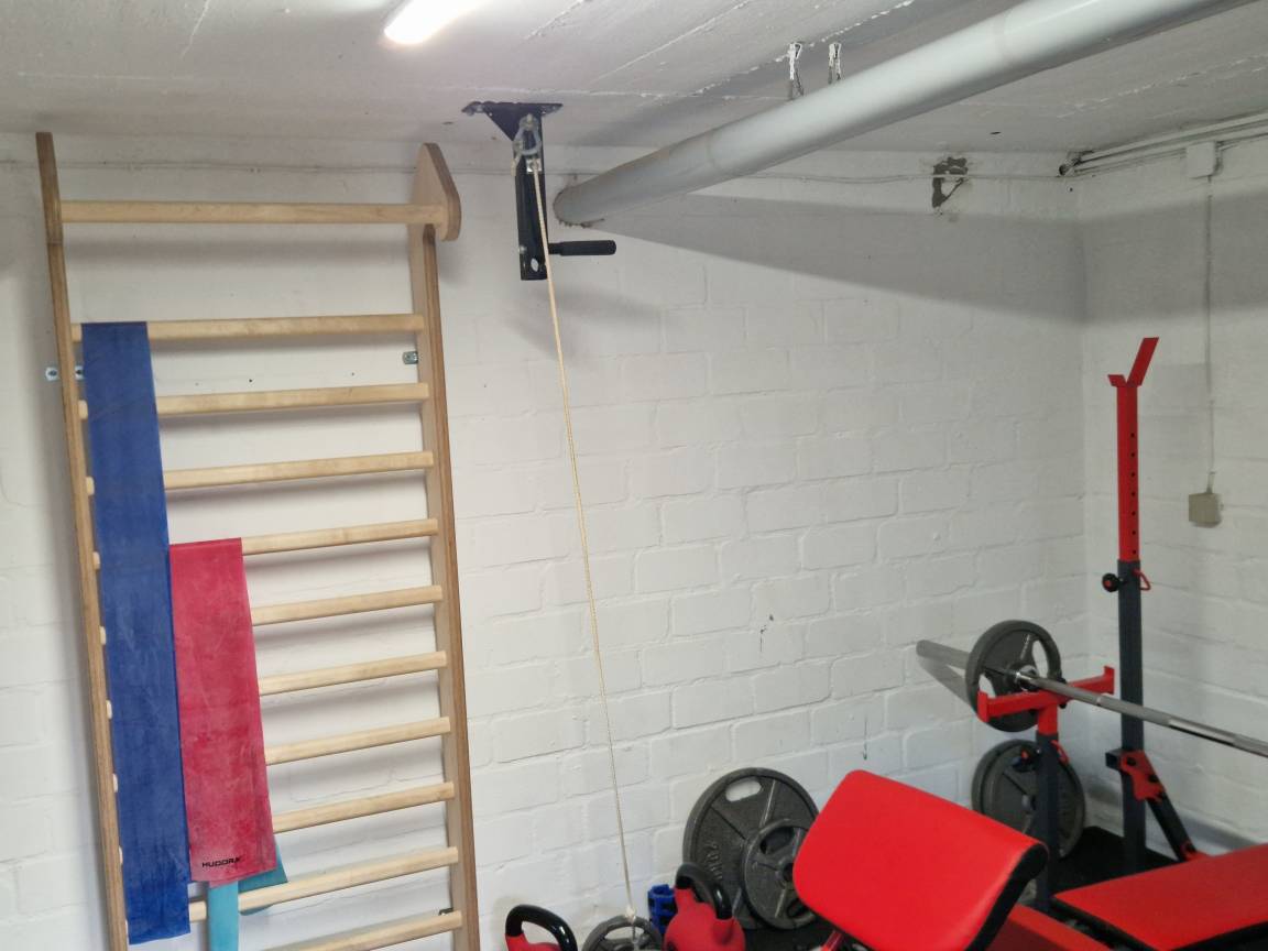 Im Keller findet sich neben Haustechnik der große Sportraum mit Langhantel-Bank, Kurzhantel, mehreren Kettlebells, vielen Gewichten und vielen kleinen weiteren Sportmöglichkeiten für jeden Geschmack. Auf dem Boden sind bereits mehrere Klebestreifen aufgebracht, die einer Koordinationsleiter nachempfunden, zu Koordinationstraining einladen. Auch an der Sprossenwand kann man viele Übungen durchführen oder einfach mit den Kindern etwas klettern, hier sollte man aber sicherheitshalber eine der vorhandenen Sportmatte unterlegen.