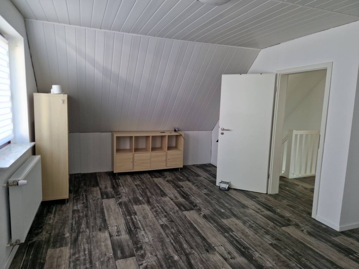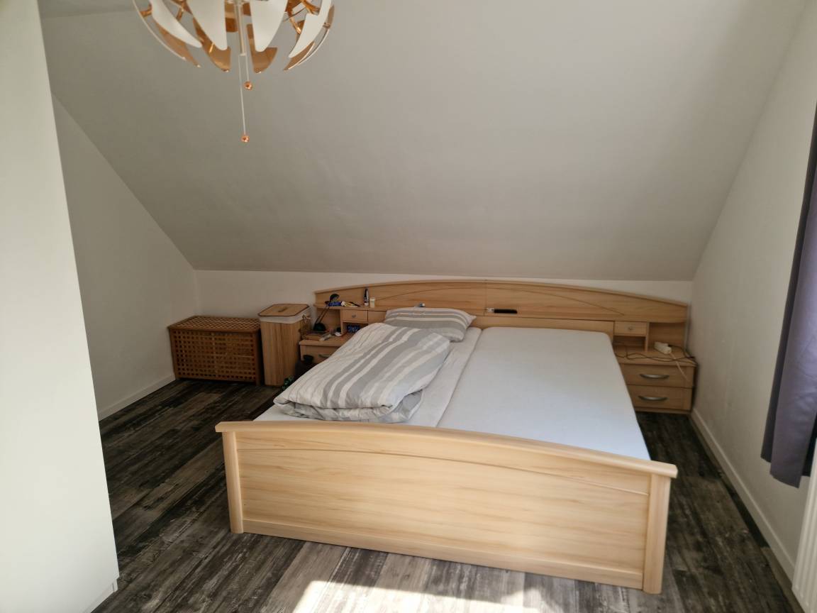 Das Obergeschoss verfügt über ein großes Zimmer, in dem weitere Betten (auch Kinder-/ bzw. Babybetten) zur Verfügung stehen. Aufgrund der Größe des Zimmers kommt man sich hier auch nicht in die Quere. Im Elternschlafzimmer auf der linken Seite stehen ein großes Doppelbett und ein großer Kleiderschrank, auch ein Fernseher ist hier an der Wand installiert. Die Fenster bieten einen wundervollen Blick auf den Wald und wer mit offenen Fenstern schläft, wird morgens in den Genuss des Vogelgezwitschers kommen.