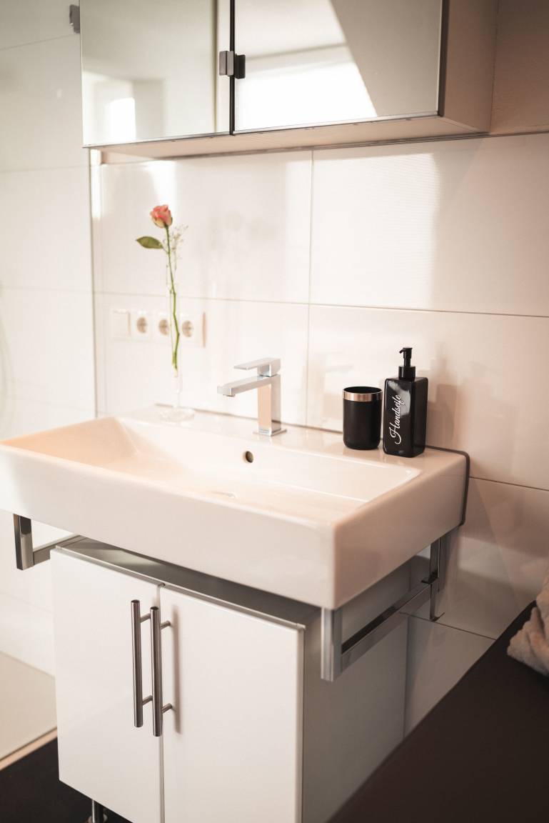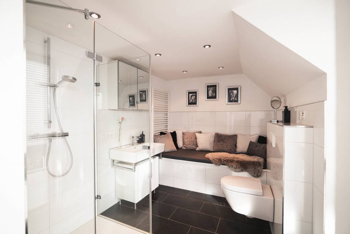 Ebenfalls im 1 Stock befindet sich das moderne Bad mit einer extragroßen Dusche, einer Loungeecke und bodentiefem Fenster. Der Waschbeckenunterschrank und ein Allibert bieten genügend Stauraum.