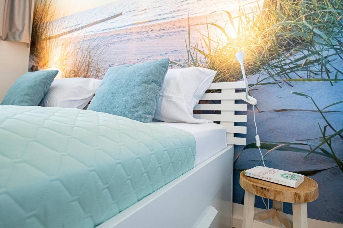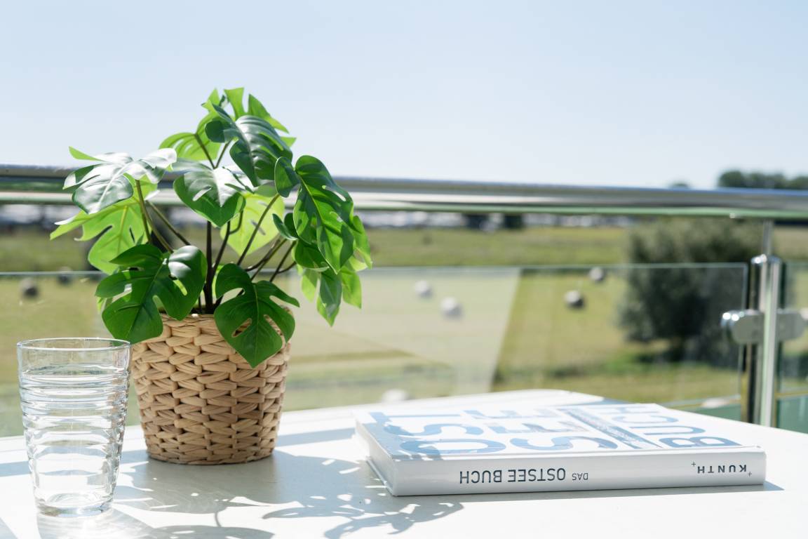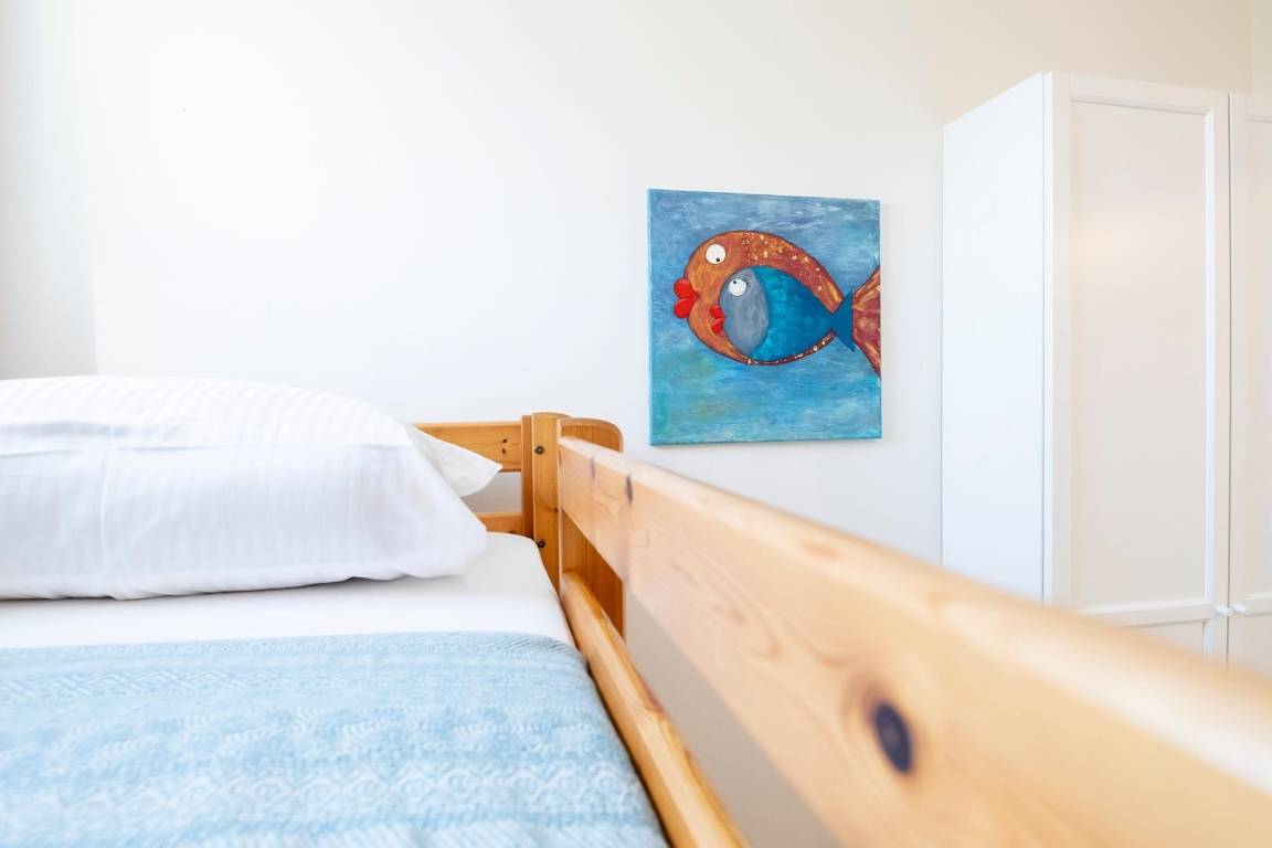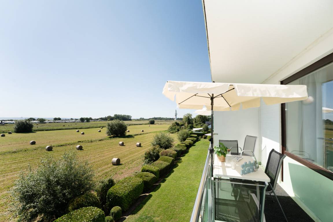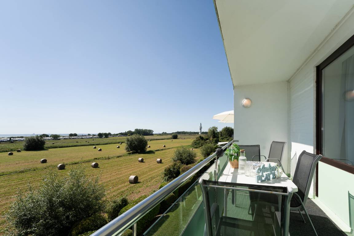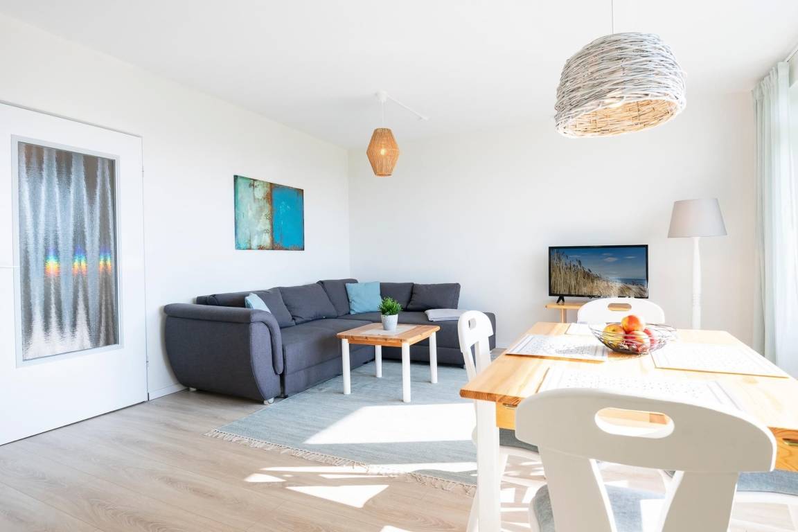 Das bequeme Sofa im Wohnbereich beschert Ihnen entspannte und gesellige Stunden. In der gut ausgestatteten, offenen Küche können Sie sich mühelos selbst versorgen und leckere Köstlichkeiten zubereiten. Sogar den Abwasch müssen Sie im Urlaub nicht selbst erledigen, das übernimmt eine Spülmaschine für Sie. Auf dem möblierten Balkon mit Sonnenschirm bietet sich Ihnen eine einmalige Aussicht auf unsere wunderschöne Ostsee. Genießen Sie das Rauschen der Wellen und Rufen der Möwen bei einem Glas Wein, während Ihnen eine frische Brise um die Nase weht. Im separaten Schlafzimmer mit Kleiderschrank verbringen Sie im großen Doppelbett (2x 90x200 cm) komfortable Nächte. Im zweiten Schlafzimmer mit Kleiderschrank steht ein Etagenbett mit (je 90x200 cm) für zwei weitere Urlaubsgäste bereit. Das Tageslichtbad mit Badewanne und Fön rundet die Ausstattung dieser Ferienwohnung ab.