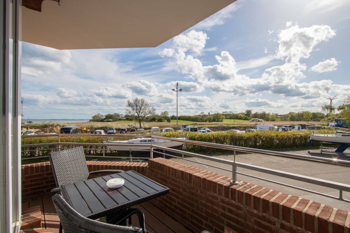 Balkon mit Blick über die Ostsee, den Hafen und das Naturschutzgebiet: Sitzgarnitur