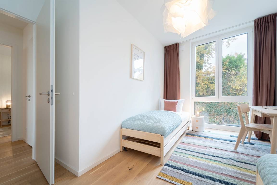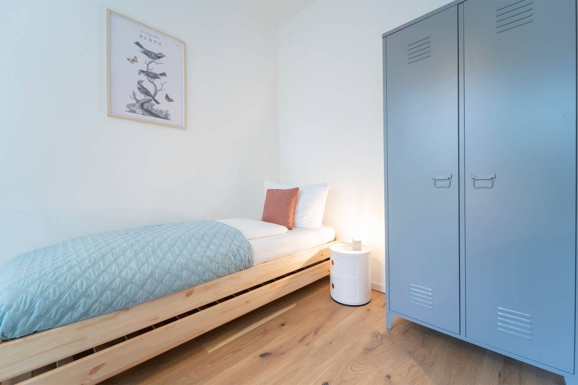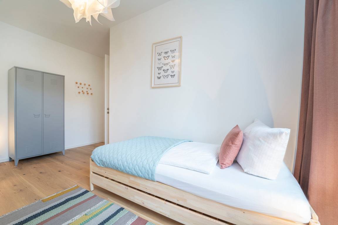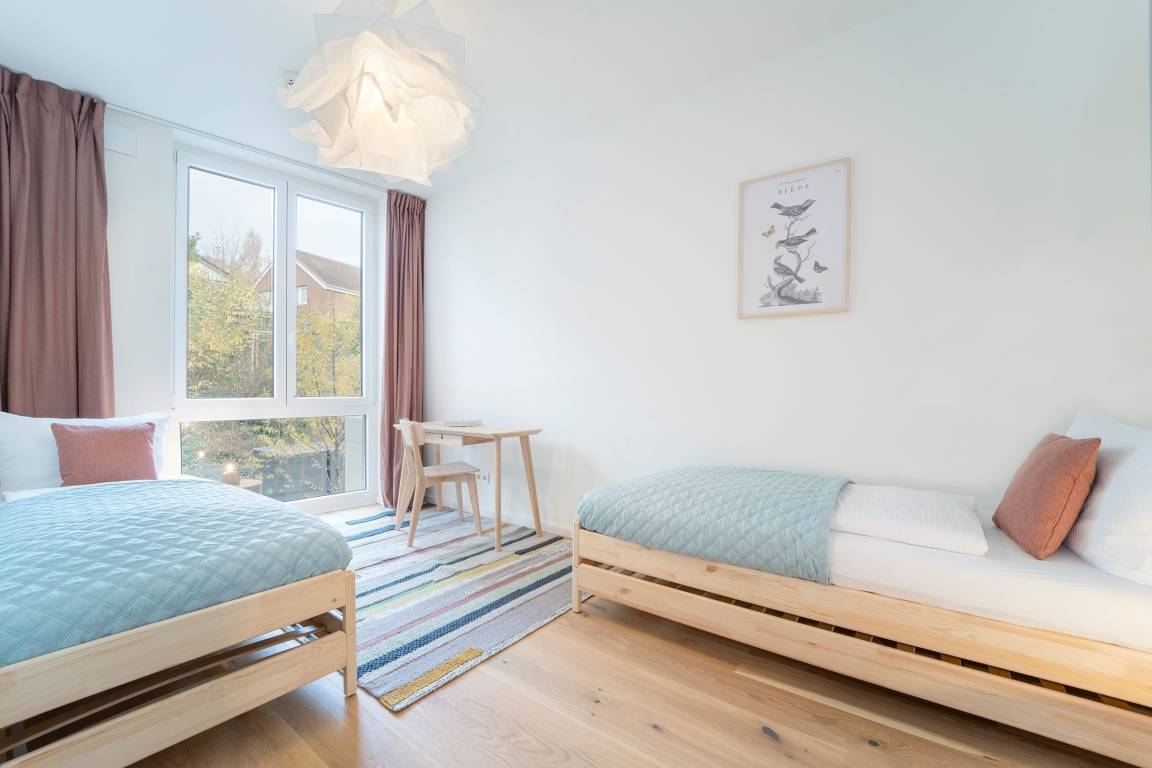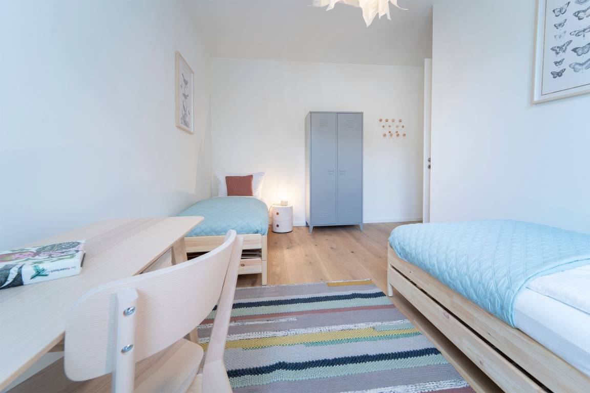 Schlafzimmer 2: 2 Einzelbetten (je 90x200 cm), Verdunkelungsmöglichkeit, Platz für Babybett vorhanden