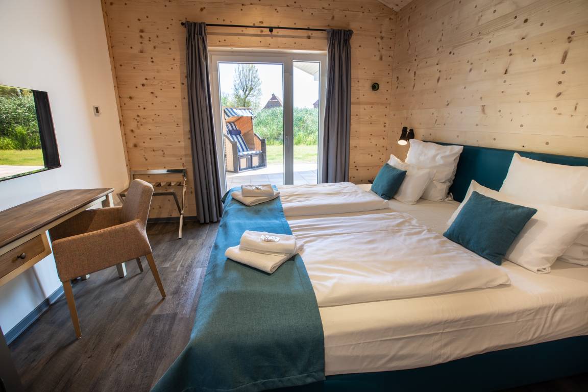 Die Reederhäuser verfügen über zwei separate Schlafzimmer mit Boxspring-Doppelbetten. Dieser Haustyp bietet eine große offene Küche mit Essecke und einen offenen Übergang zum Wohnbereich mit Kaminofen. Ein Vollbad mit Badewanne, Dusche und Sauna sowie ein separates Gäste-WC runden die Ausstattung ab.