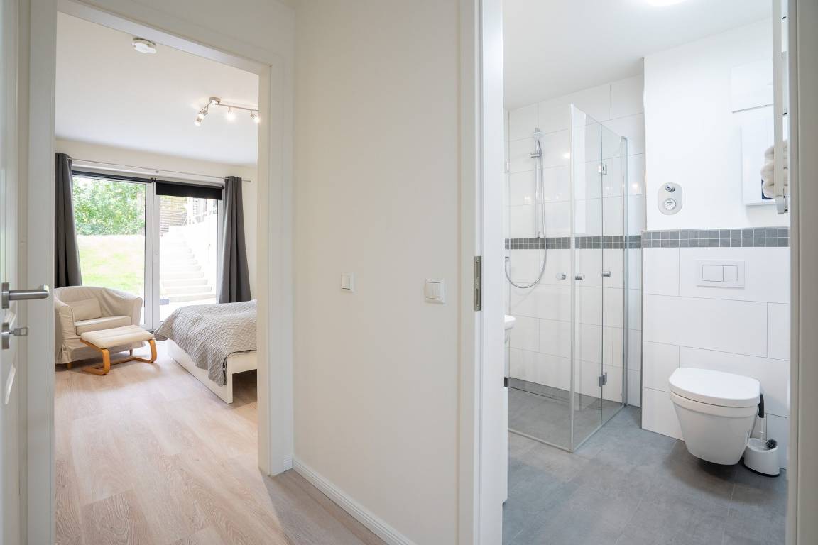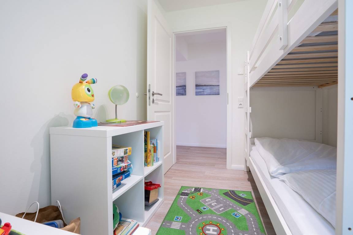 Das Herzstück der Familienkoje Marina ist der gemütliche, offene Wohnbereich - hier ist Platz zum Kochen, Essen, Spielen oder Kuscheln auf dem Sofa. In der modernen Küche macht das Kochen auch im Urlaub Spaß und Sie entscheiden selbst, ob Sie das Essen am großzügigen Esstisch oder auf der Terrasse mit Blick in den Garten genießen wollen. Zur Nacht kann sich jeder Urlaubsgast in sein eigenes Reich zurückziehen, denn hier laden gleich 4 Schlafzimmer zum Träumen und Relaxen ein. 2 Schlafzimmer sind mit je einem großen Doppelbett (2x 90x200 cm), Kleiderschrank und TV ausgestattet. Das dritte Schlafzimmer verfügt über ein Etagenbett (je 90x200 cm) und Kleiderschrank. Das vierte große Schlafzimmer begeistert mit einem Feuerwehr-Bett (90x200cm) , sowie 2 weiteren Einzelbetten (je 90x200 cm) und viel Platz zum Spielen besonders unsere kleinen Urlaubsgäste. 2 Badezimmer mit Dusche garantieren einen stressfreien morgendlichen Ablauf und alle starten entspannt in den Tag.