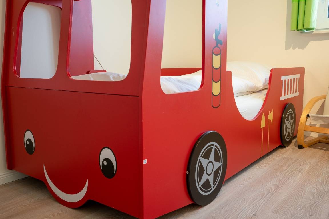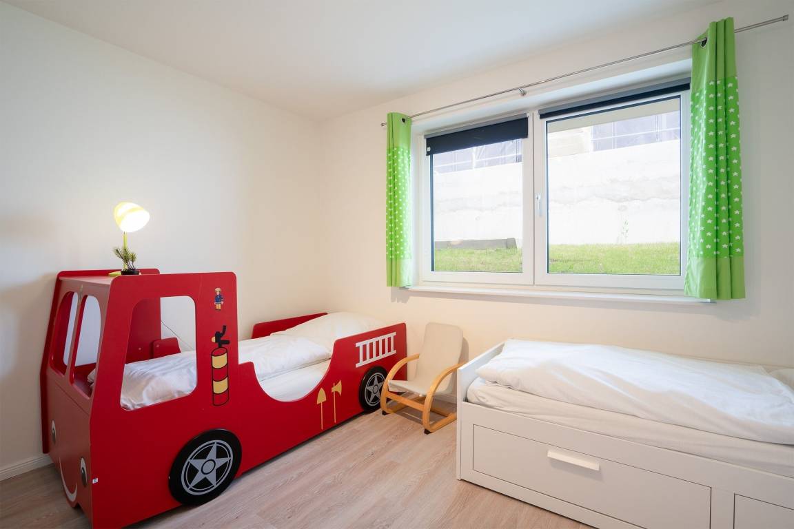 Schlafzimmer 3: 2 Einzelbetten (je 90x200 cm), 1 Feuerwehr-Einzelbett (90x200cm) Kleiderschrank, Verdunkelung (Rollo und Gardinen), Platz für Babybett
